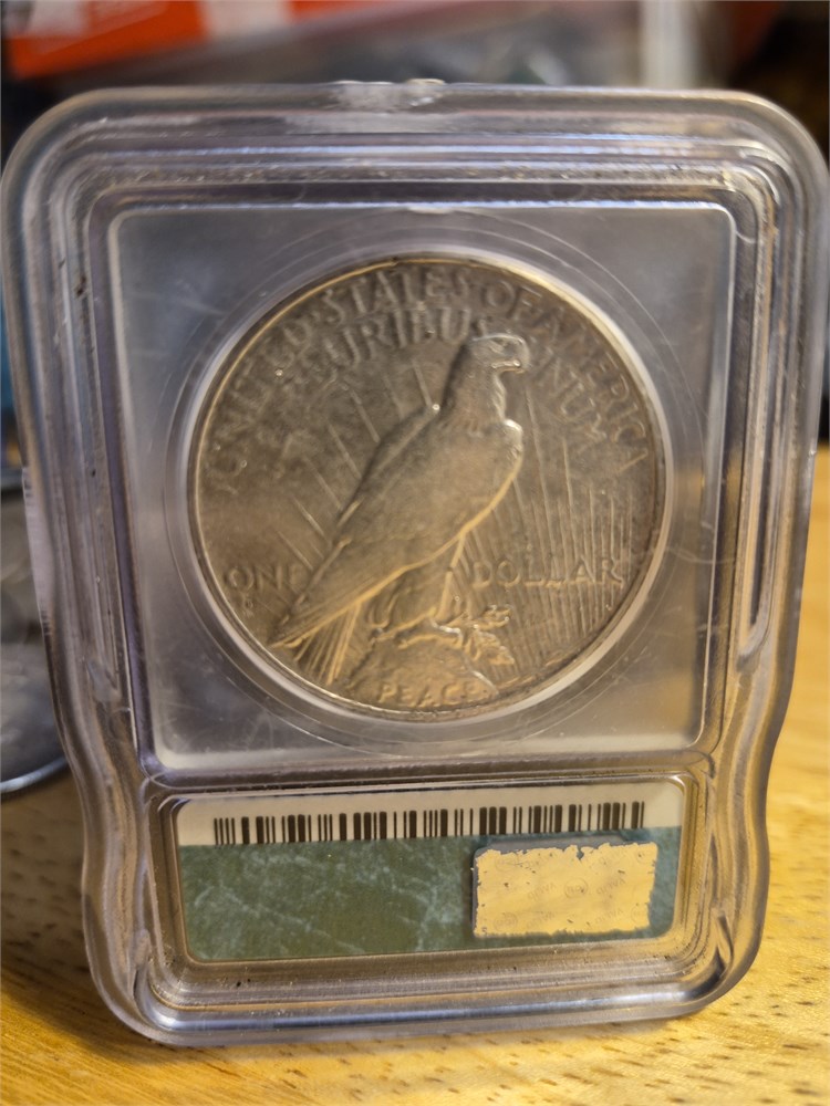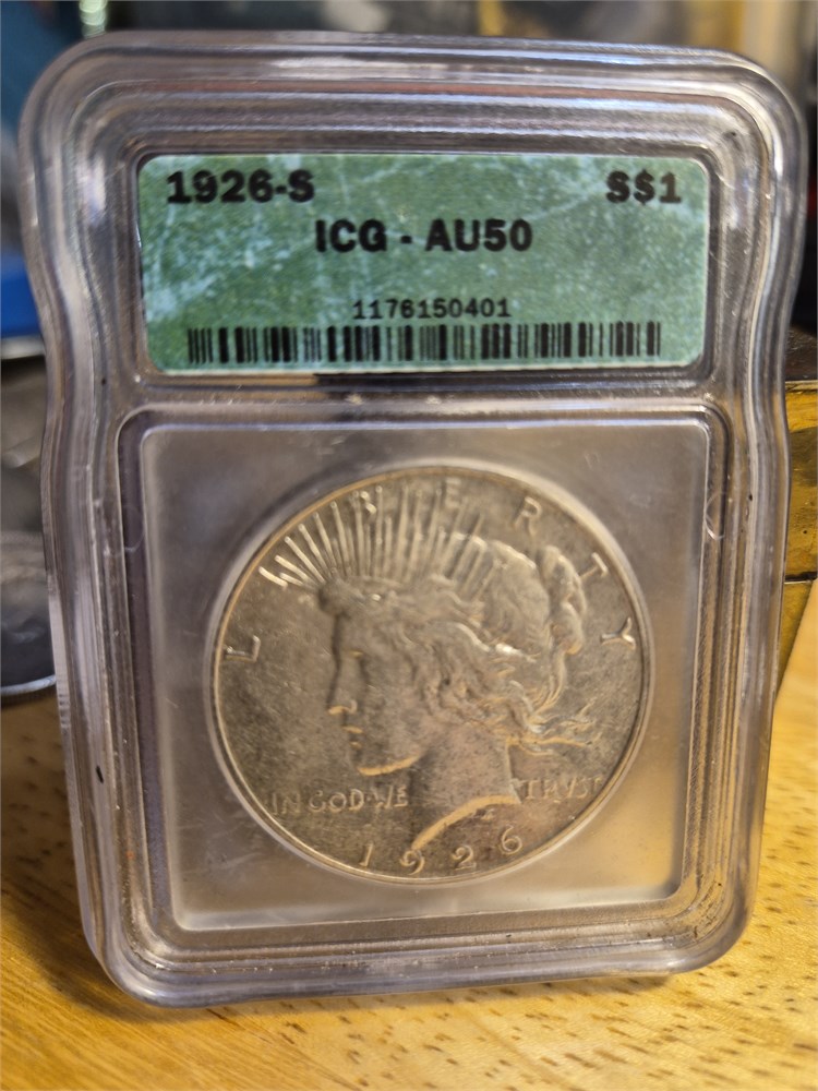 1926 S silver peace dollar. Coin is graded by icg Grading Services and has a grade of AU 50.