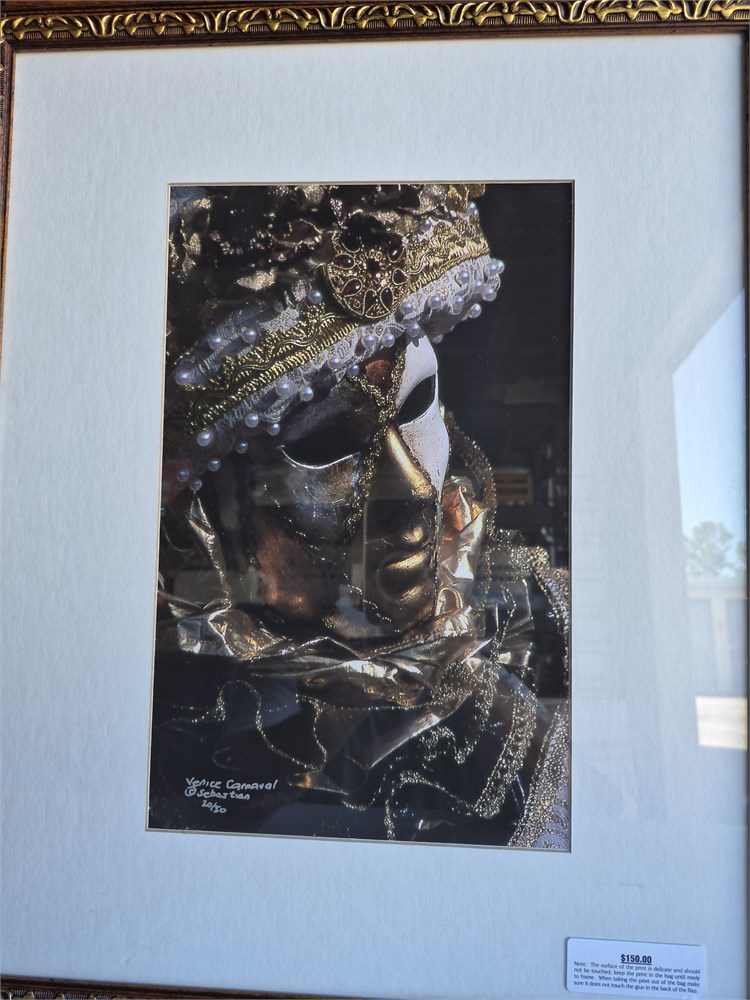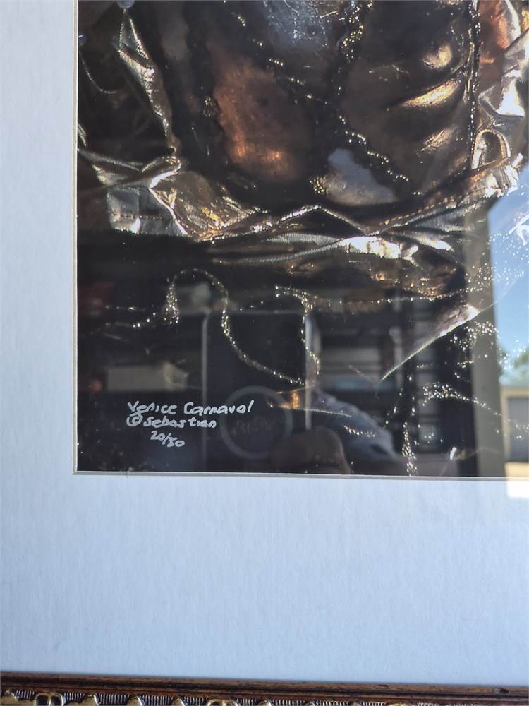 Very nice framed and signed artwork. Peace is signed Venice Carnival Sebastian 20 of 50. This is photo art and inside frame total measurement 24 in tall and 19 in wide. Original retail was $150.