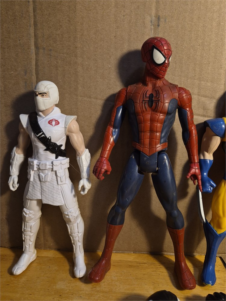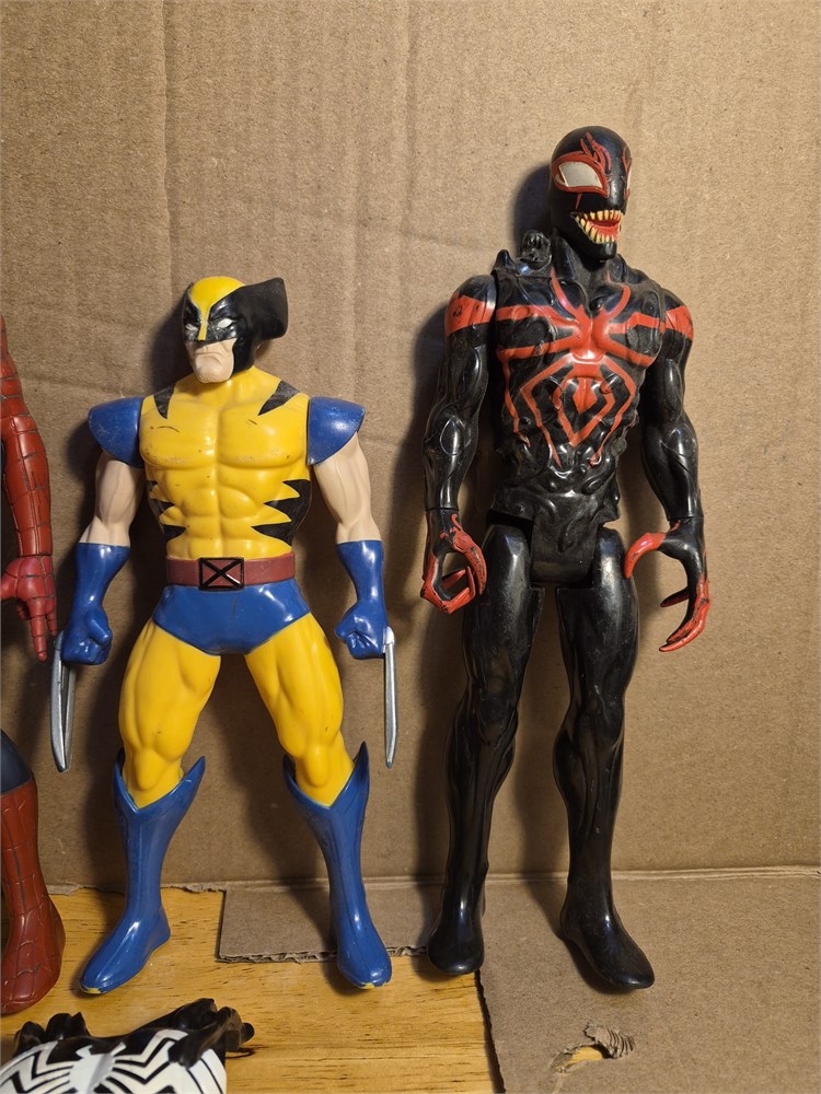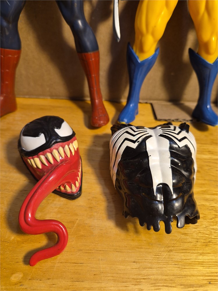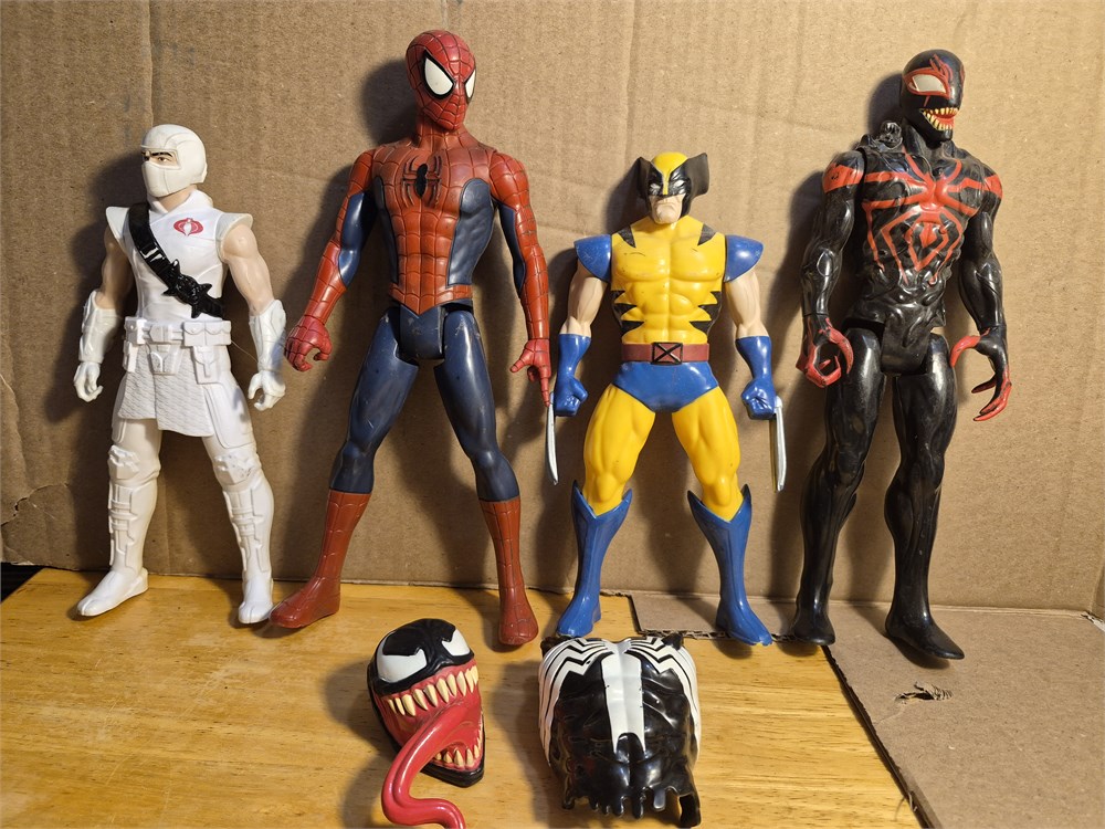 Lot of four superhero and villains figures includes when GI Joe approximately 10 in tall wolverine 10 in tall and Spider-man with Venom both 12-in figures. Also includes venom mask and Venom chest plate.