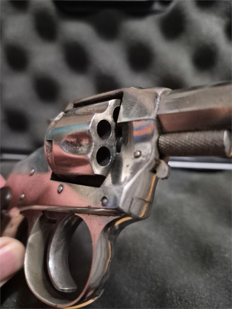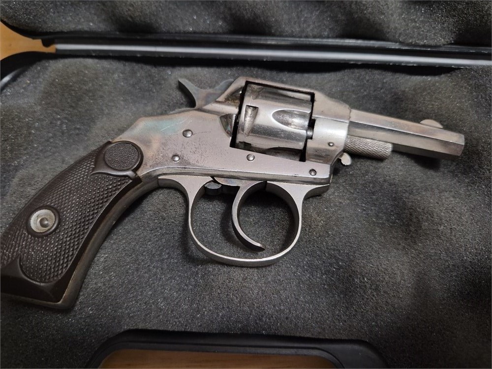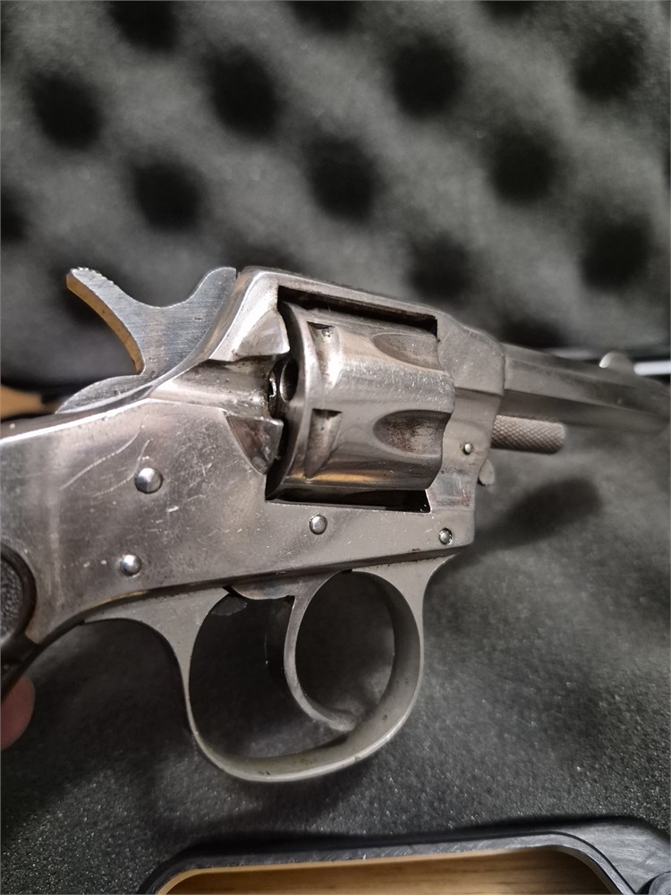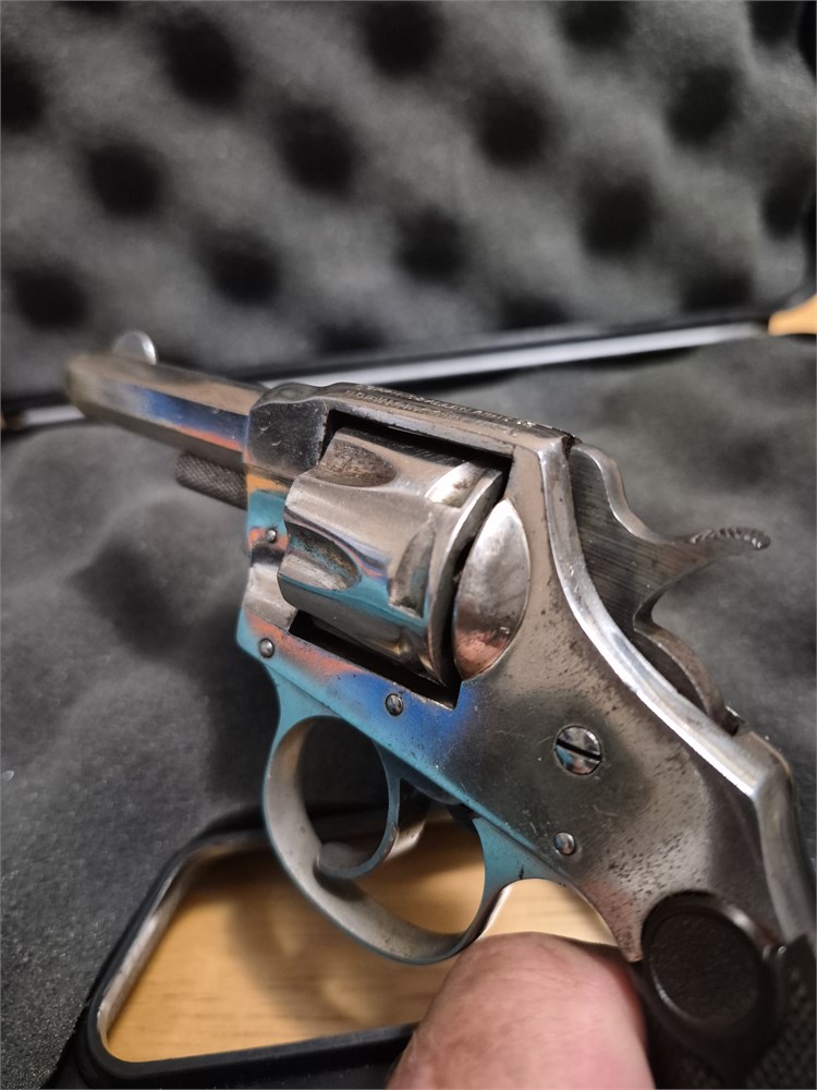Nice 1910 Hopkins & Allen .22 revolver. Cylinder is 7 shot. Gun only works as single action. Needs spring repaired for double action. Comes with hard plastic case.