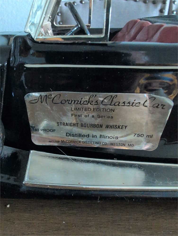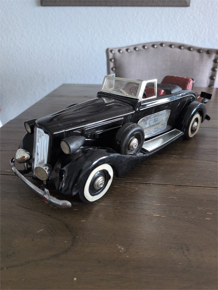 Very difficult to find these. This one seems to be complete, it still has the tax stamp but it is empty. It is a model of a 1937 Packard. It is diecast and ceramic combination. It measures approximately 16 in Long, holds 750 ml
