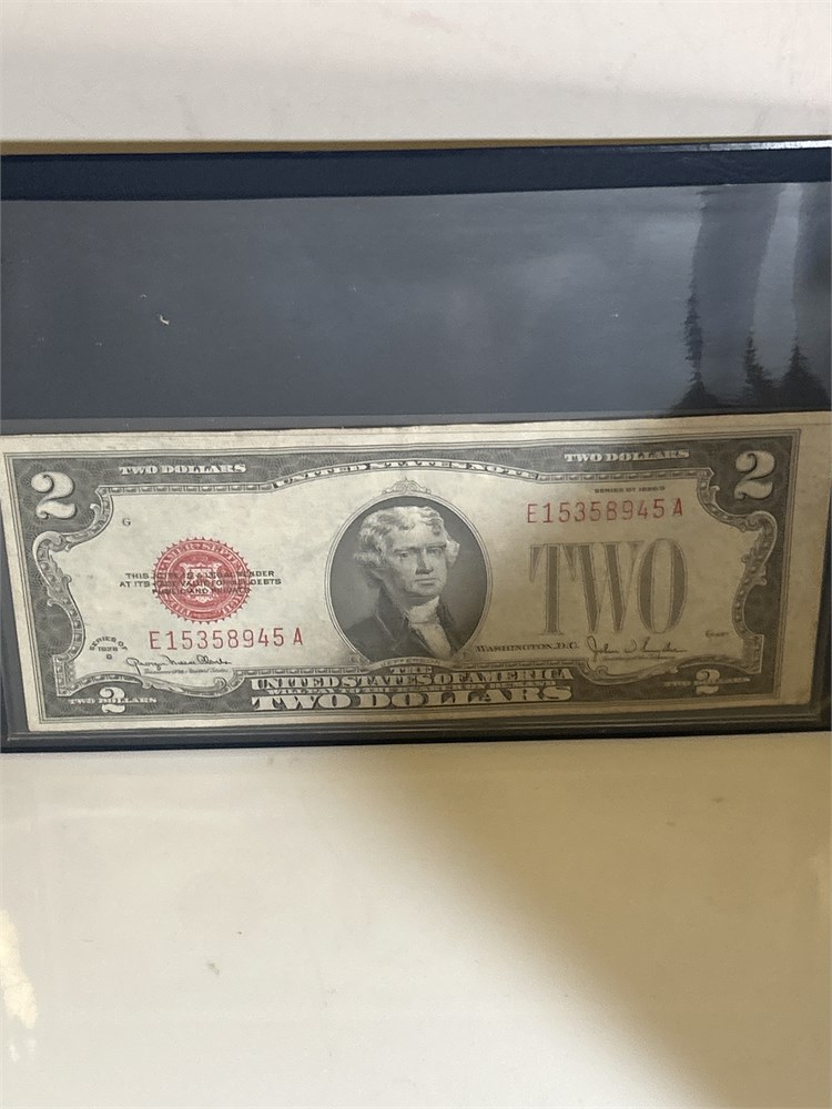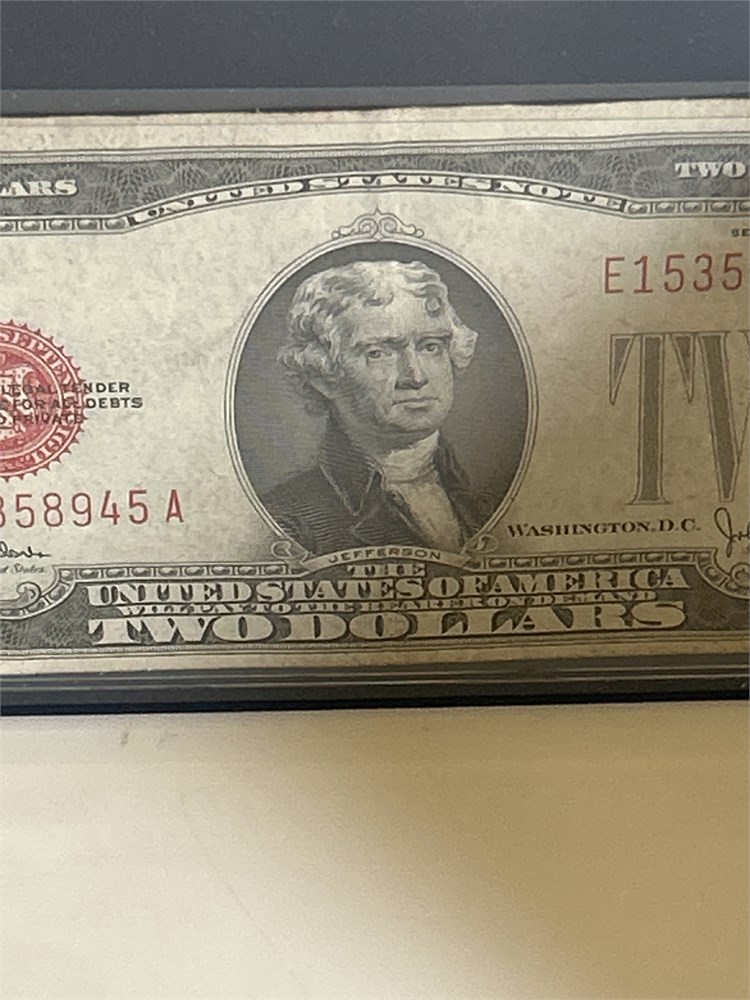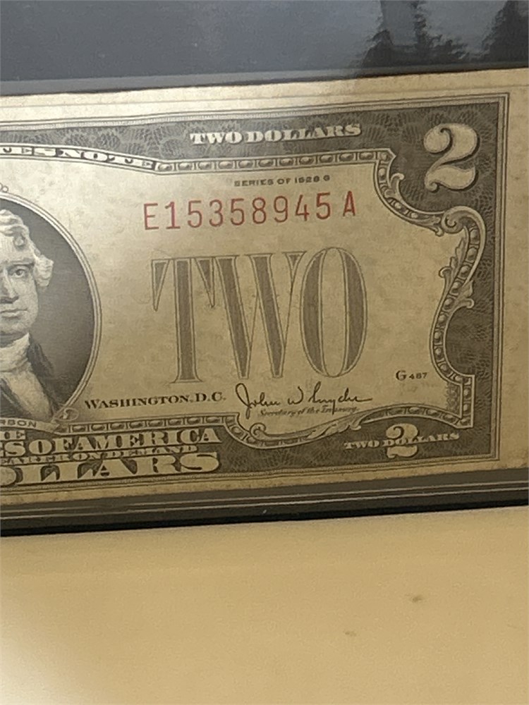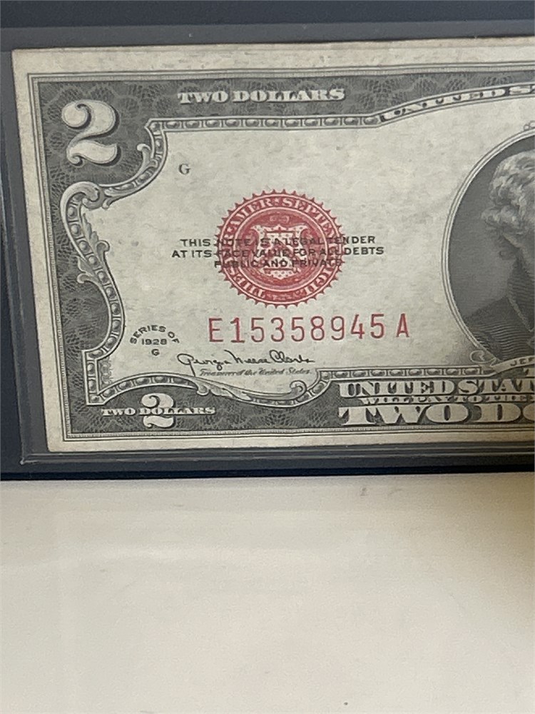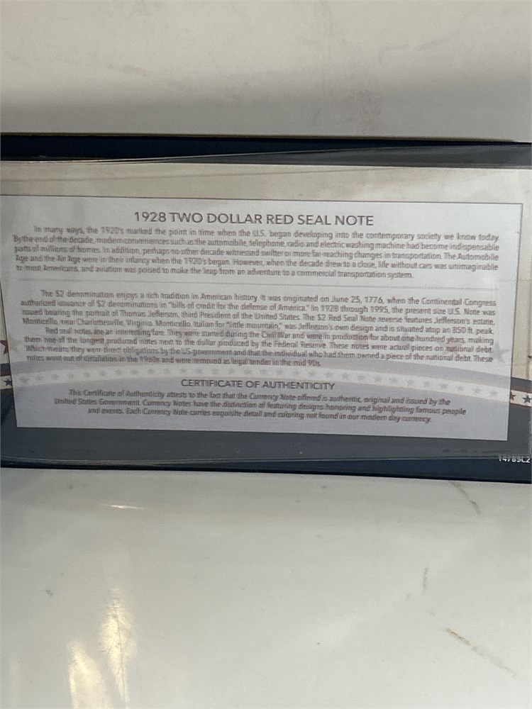 1928-G $2 Two Dollar U.S. Red Seal Jefferson Bank Note With paperwork
