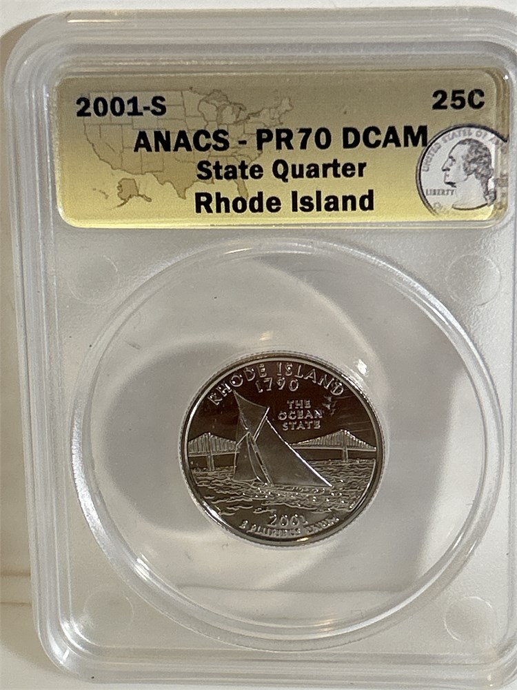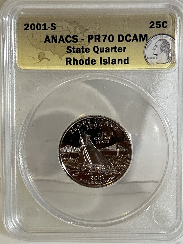 2001 S Anacs  25c Rhode State Quarter, Rhode Island PR 70–dcam