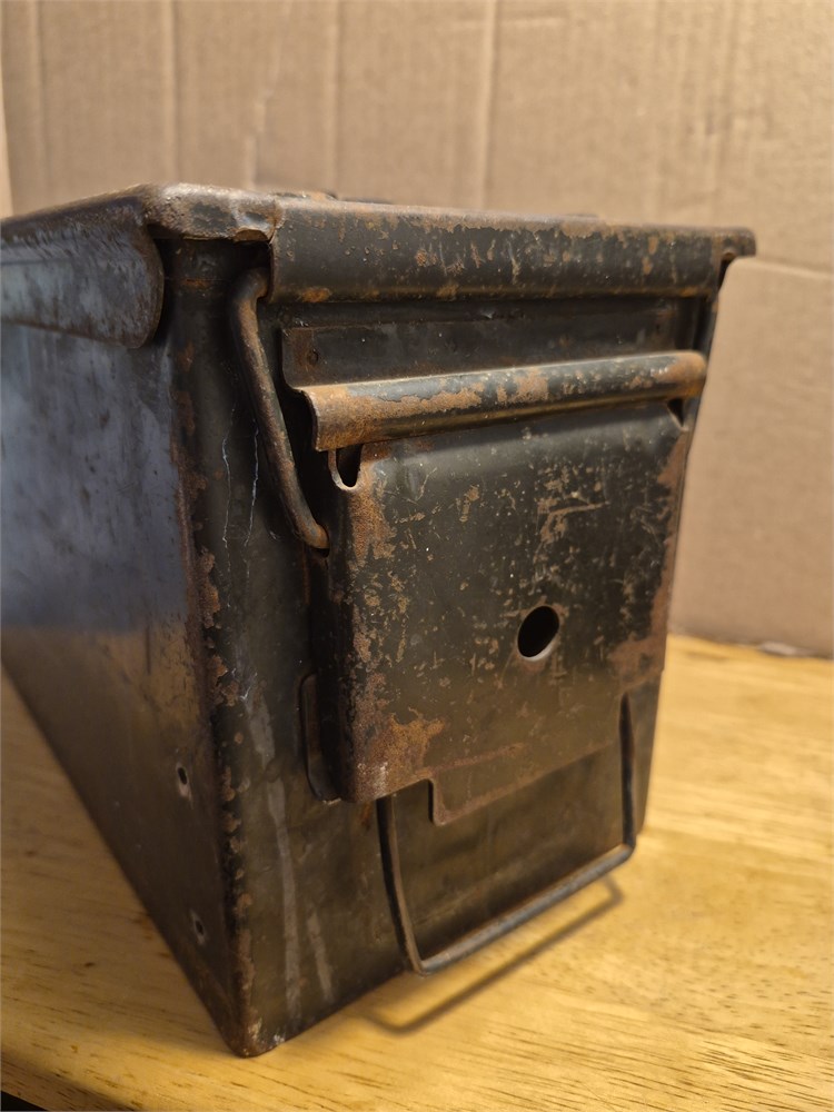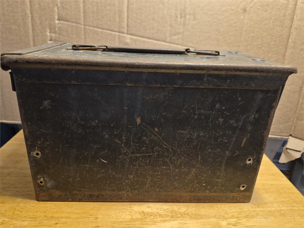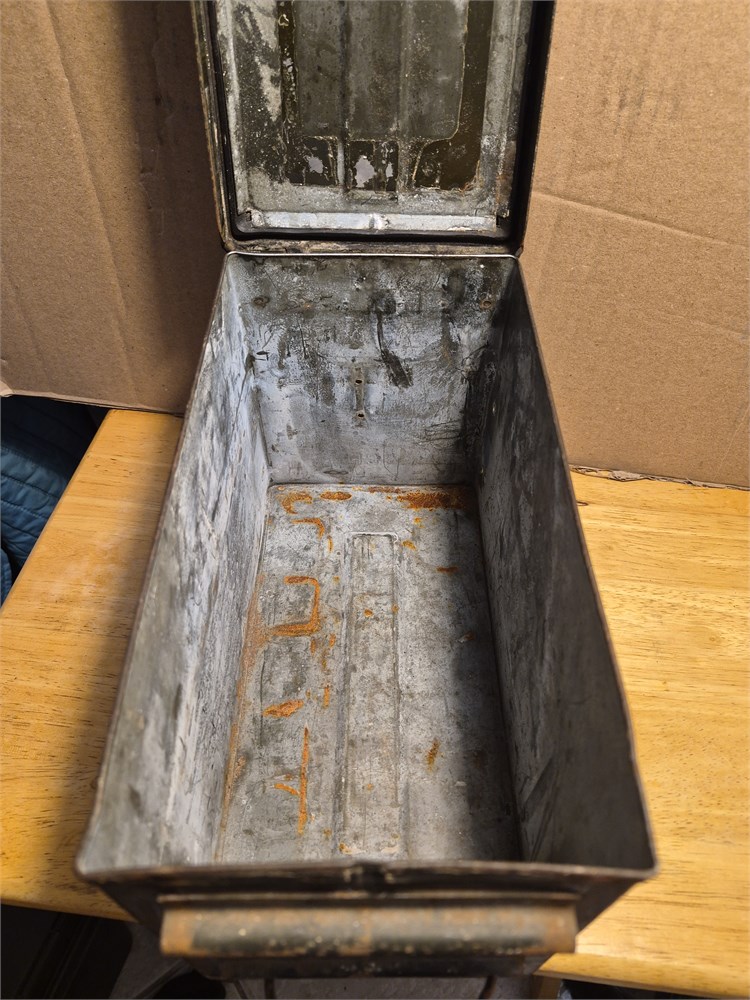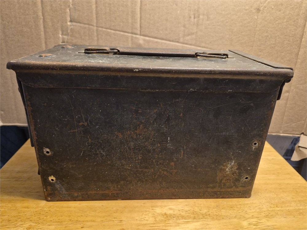 Older metal ammo box. Boxes in a little rougher shape but still in usable condition. Measures 11 in Long 6 in wide 7 in tall.