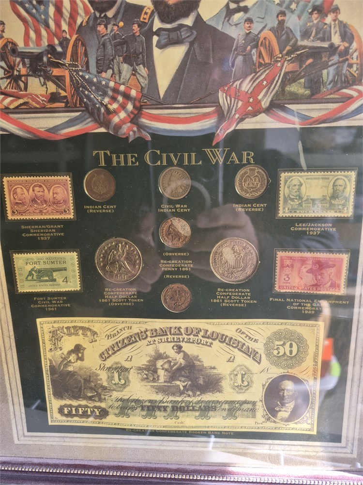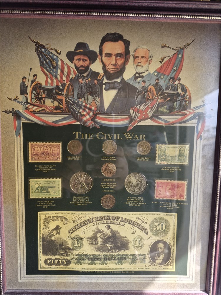 Vintage Treasury of the Civil War & Old West Framed Coins Stamps Lincoln Medal. Only a few of these coins are real.