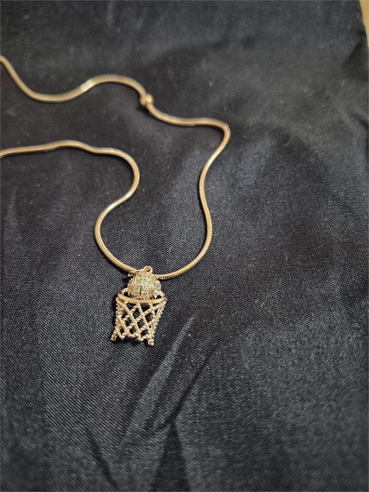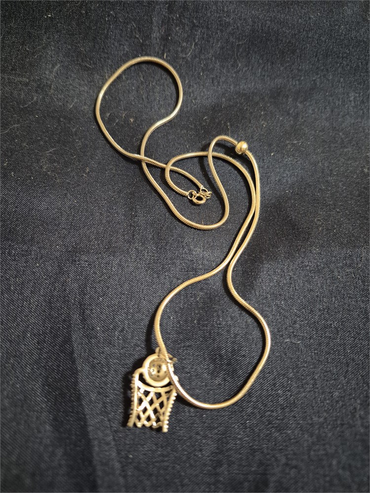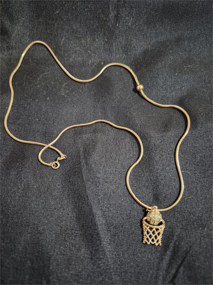 Very nice sterling silver necklace. Necklace weighs 10.04 g. Necklace is a basketball going through a hoop.