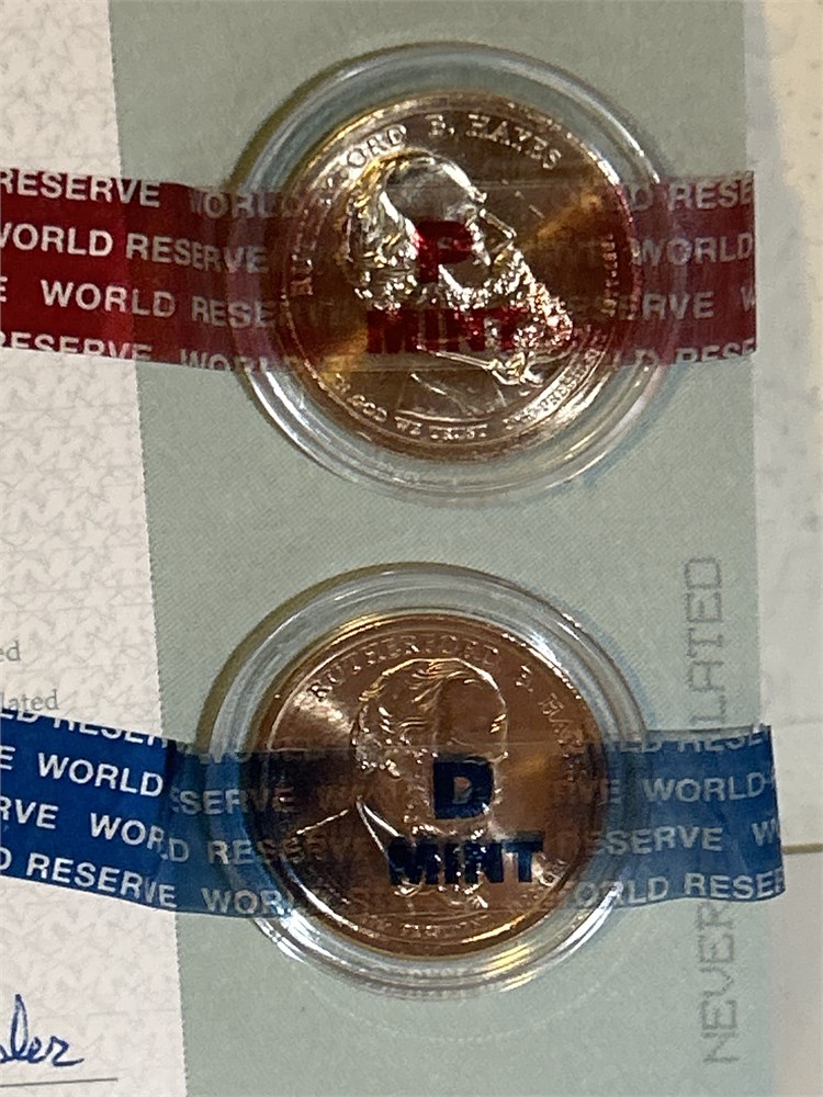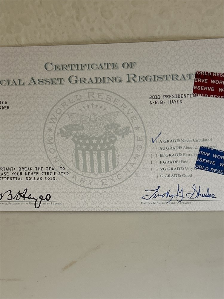 Certificate Of Official Asset Grading Registration Presidential Dollars I – R – B. Hayes two uncirculated coins.