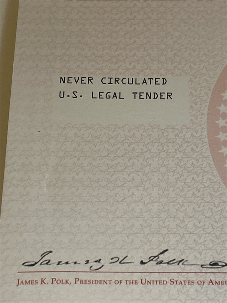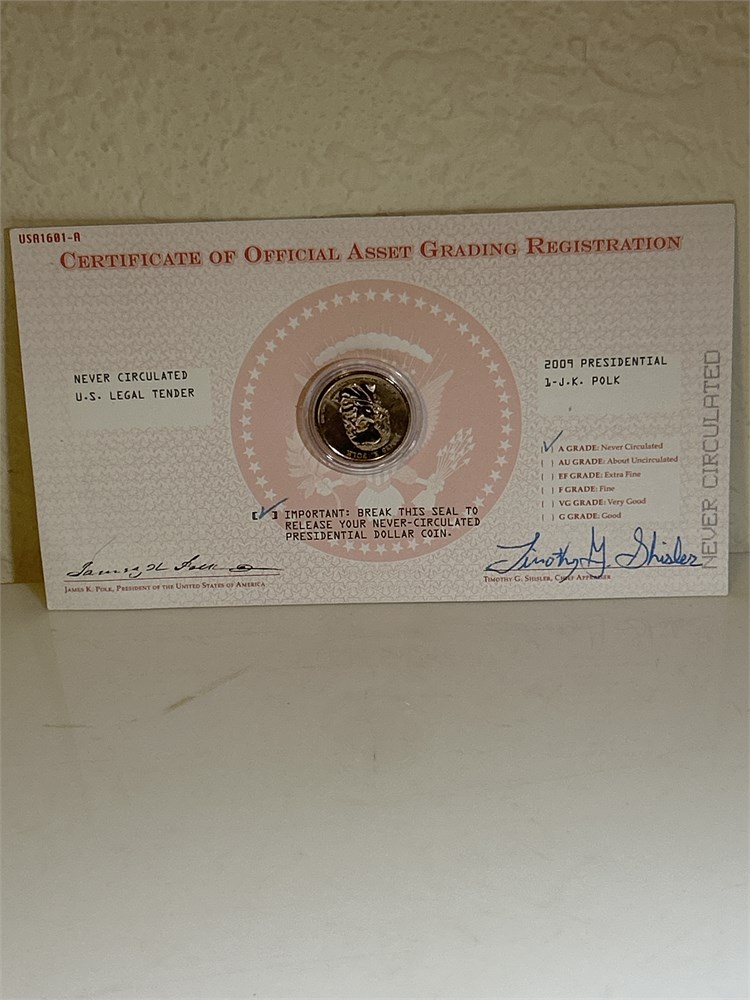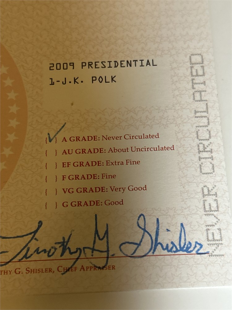 Certificate Of Official Asset Grading Registration Presidential Dollars I – J – K. Polk 2009.