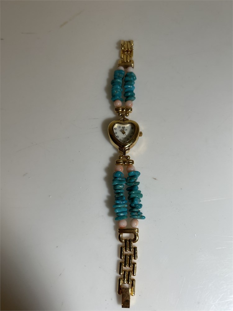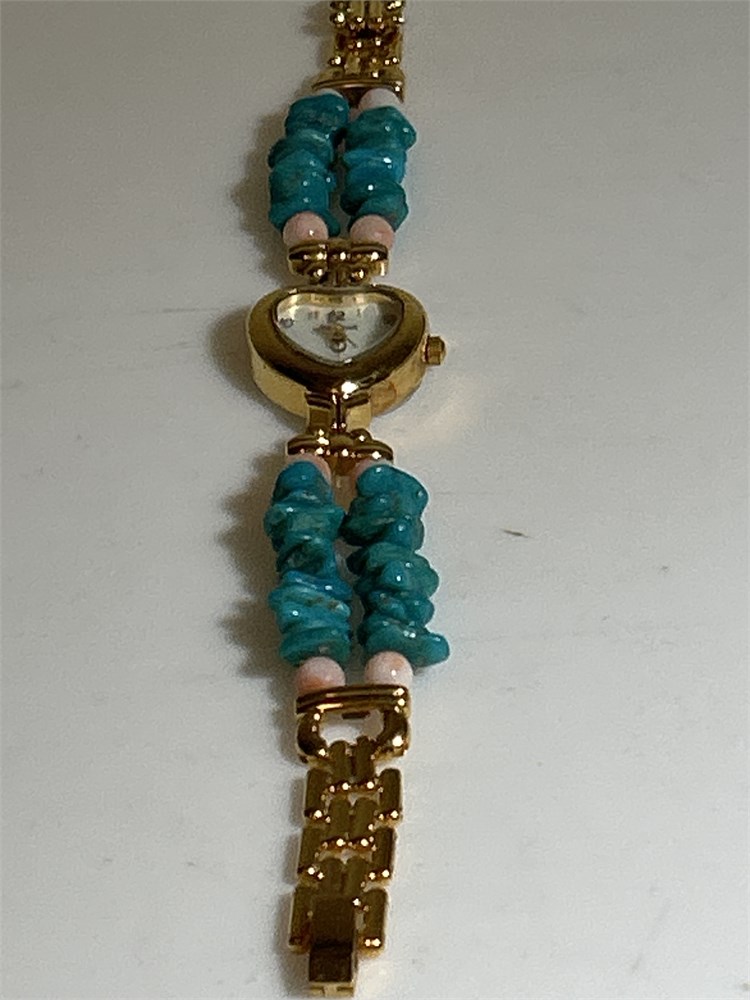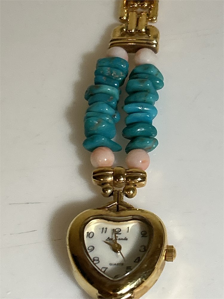 Vtg Lee Sands Turquoise Coral Heart Shaped Gold Tone Ladies quartz watch