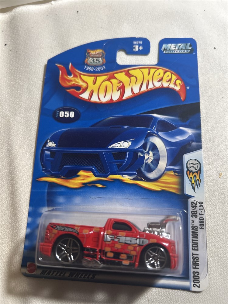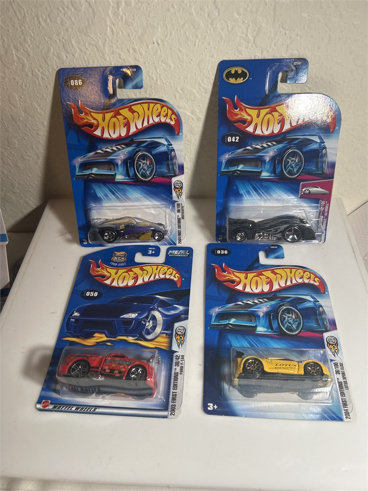 2004 first edition Batmobile, 2004 first edition ballistic, 2003 first edition Ford F150, and 2004 first edition lotus sport