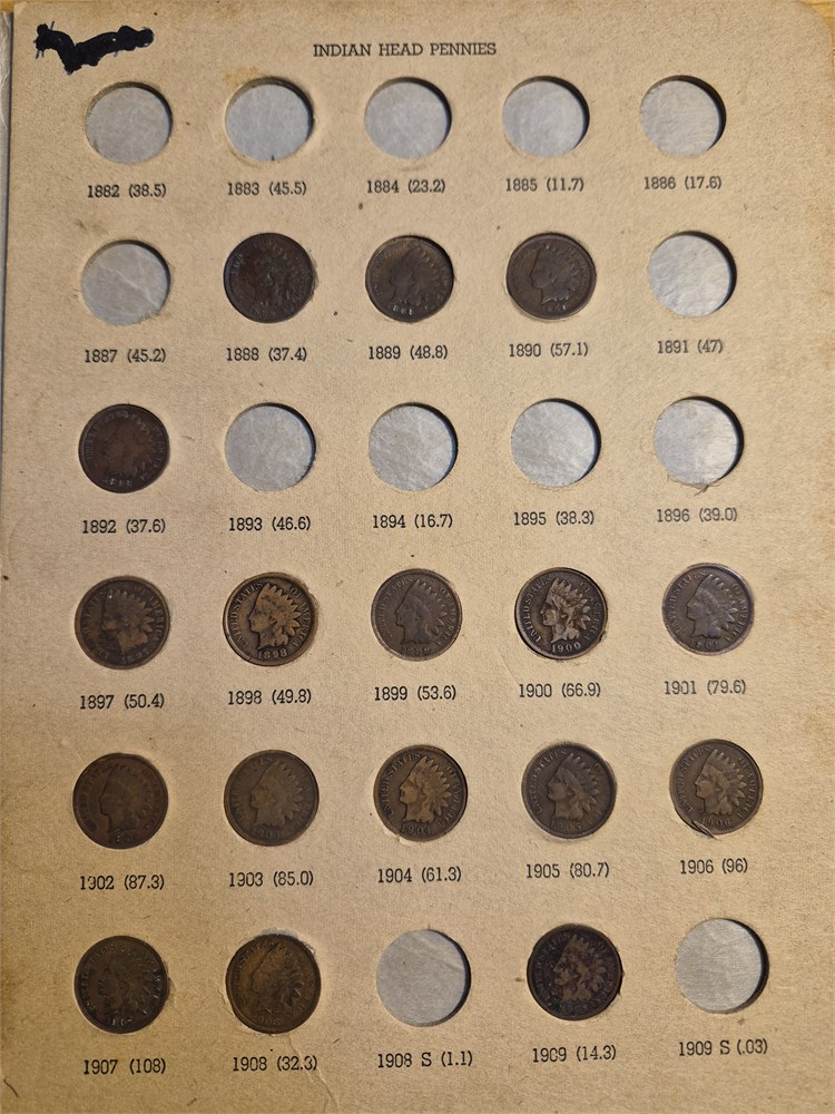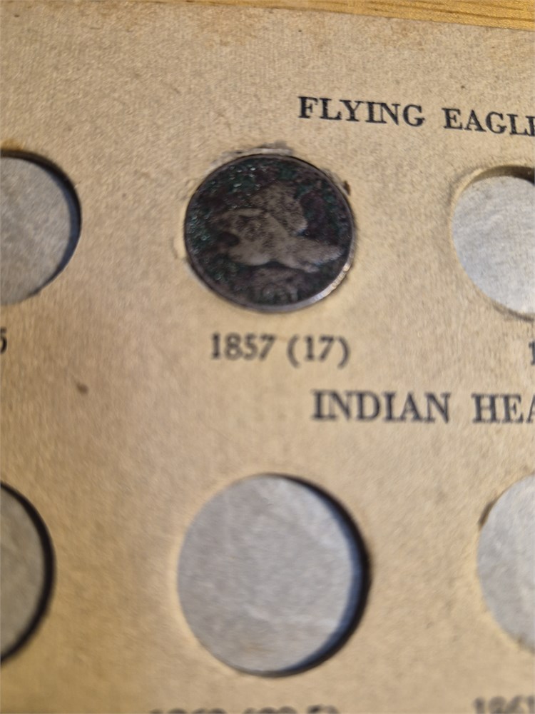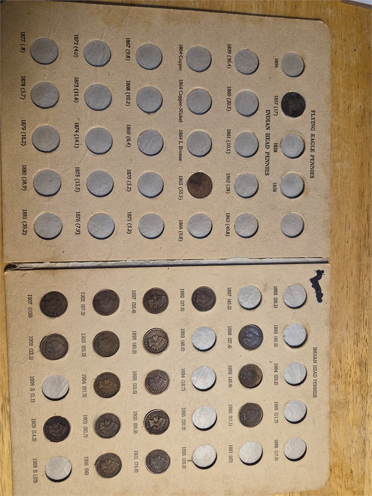 Nice lot of 19 Indian Head pennies included in Indian Head book. This book also includes an 1857 flying eagle penny. Coins all look to be in well circulated condition. Pennies are all in there right dates lots.