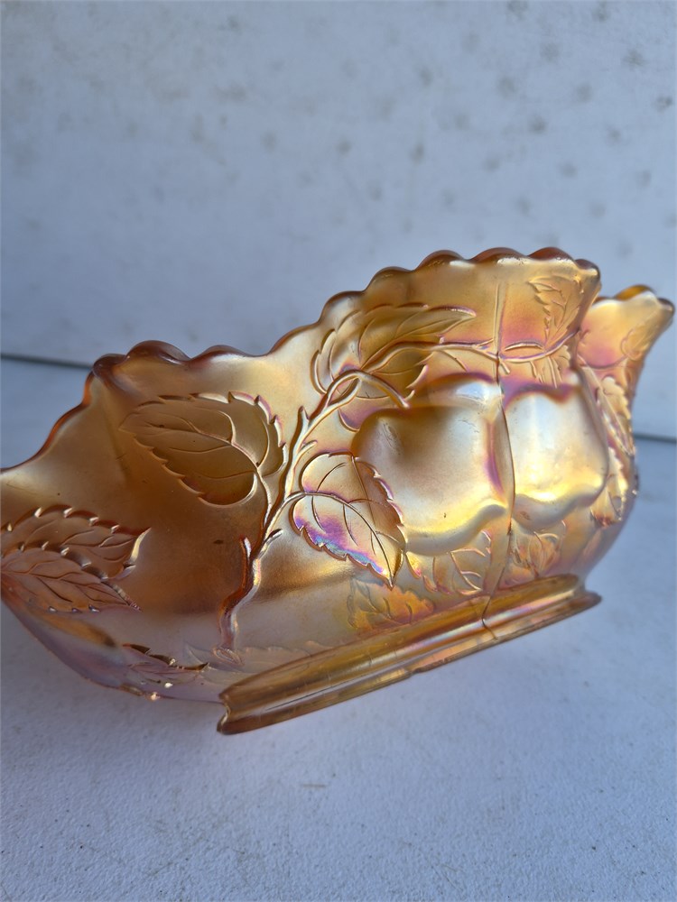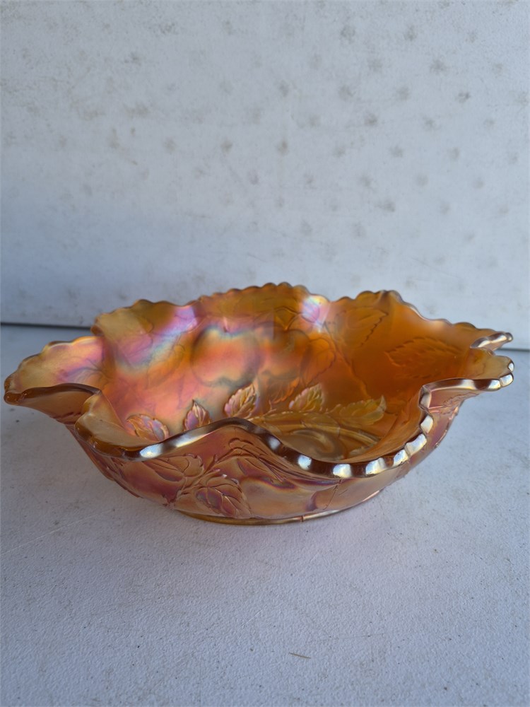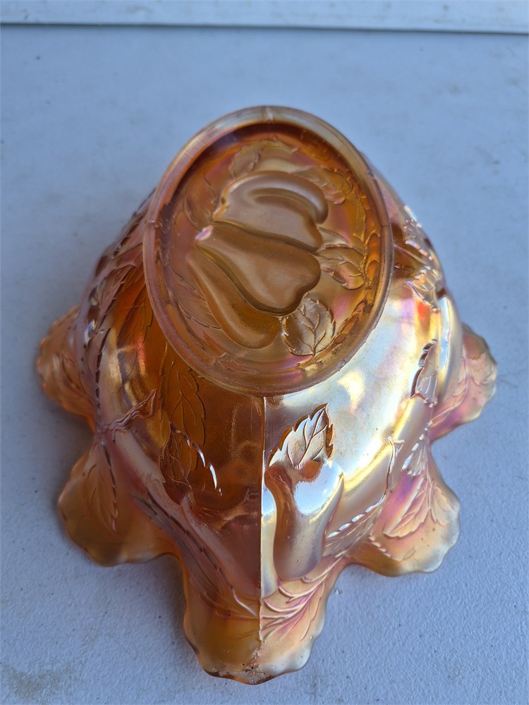 Vintage Carnival Glass, Orange Carnival Glass, Dugan, 1920's, Dugan Bowl, Depression Glass, Orange Depression Glass, Pear Bowl. Bull measures nearly 13 in across center. There is a small chip in the footing of the bowl please see in picture.