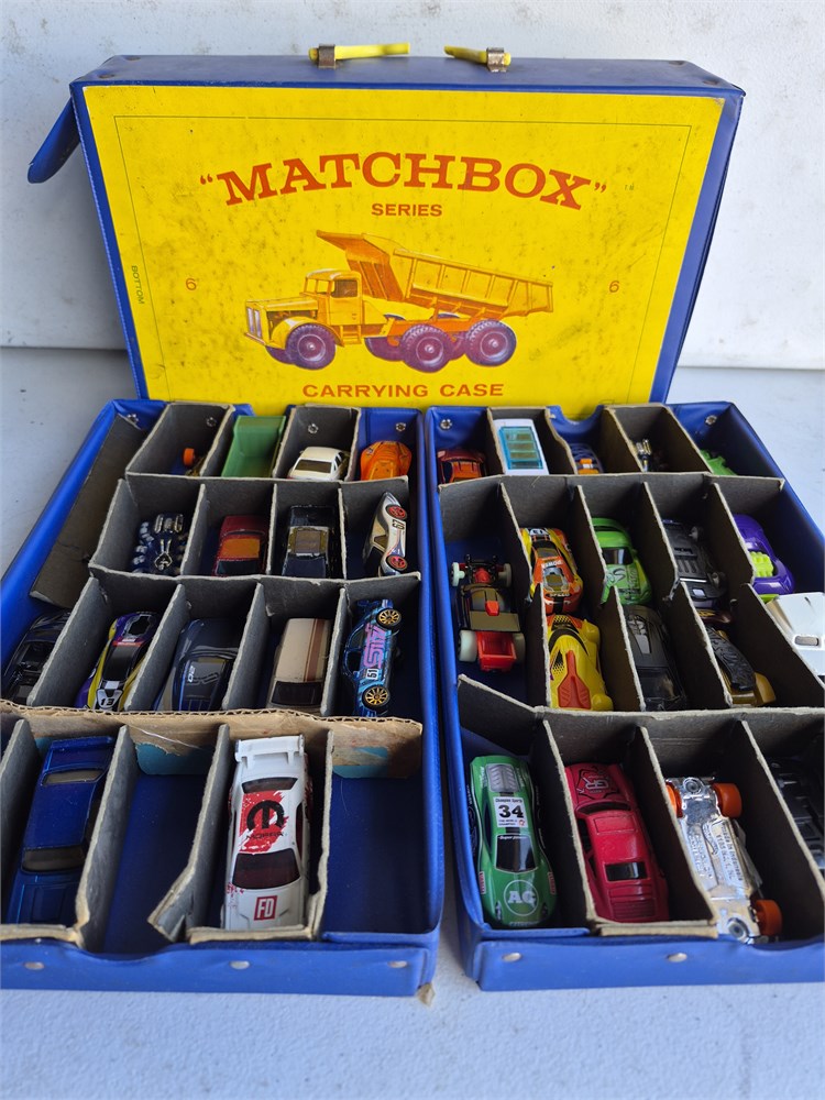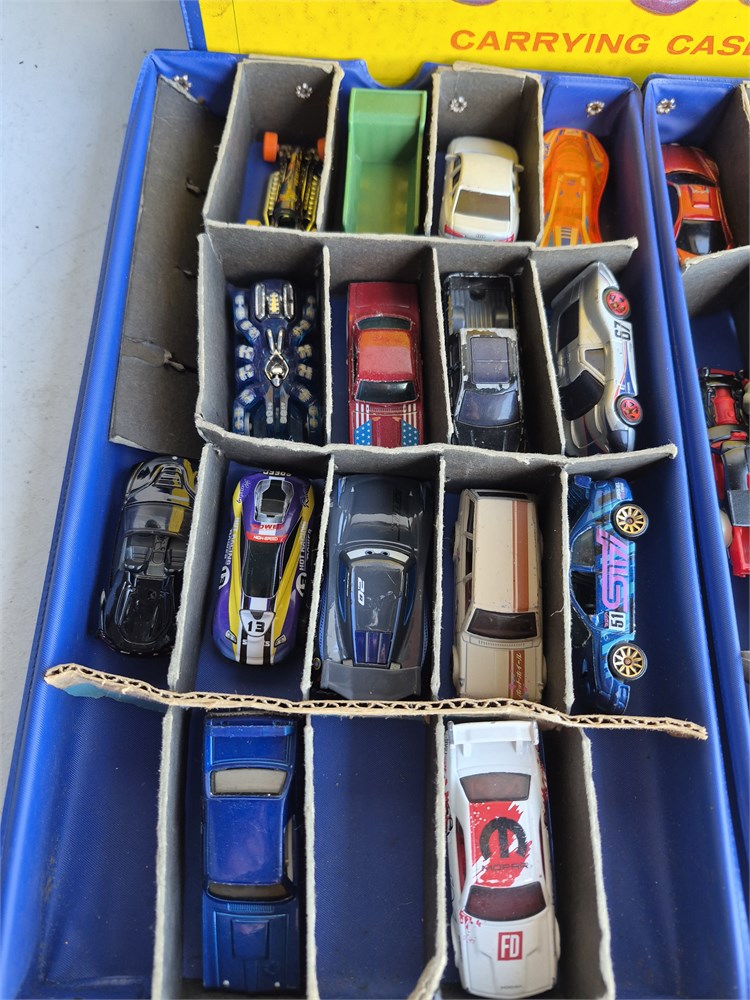 Vintage 1965 Matchbox case. Case is full of cars. But looks to be mostly newer hot wheels.