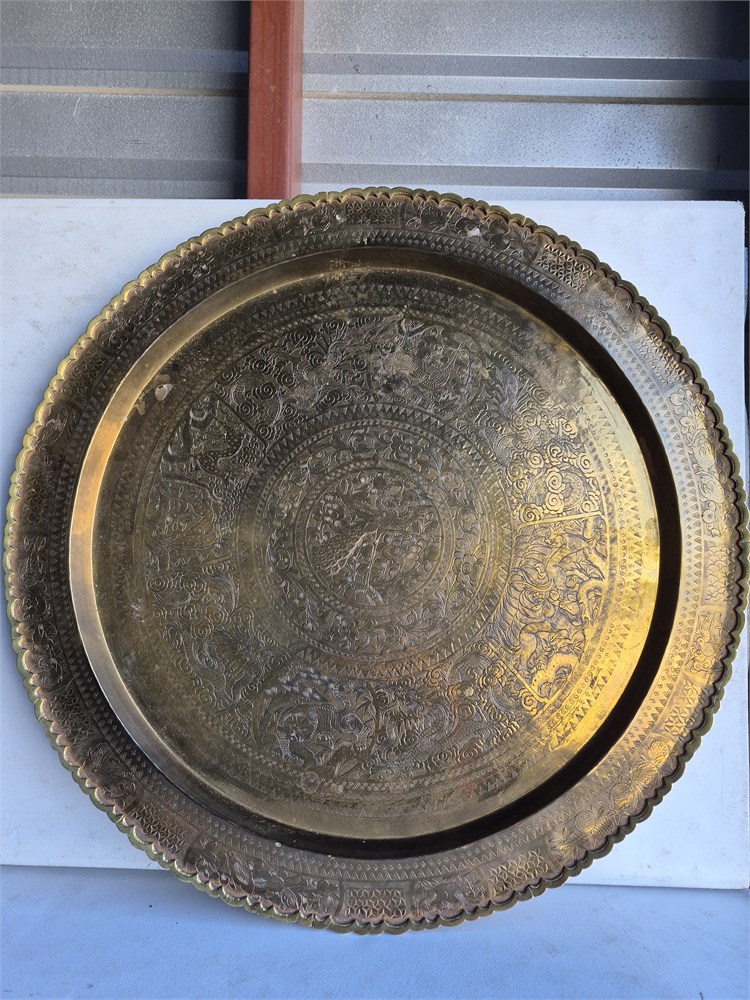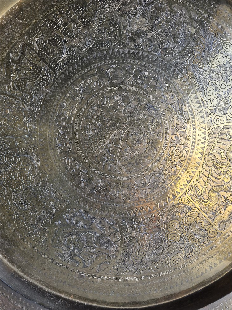 Vintage Indian Brass Charger Tray Decorated With Birds 30" (R)