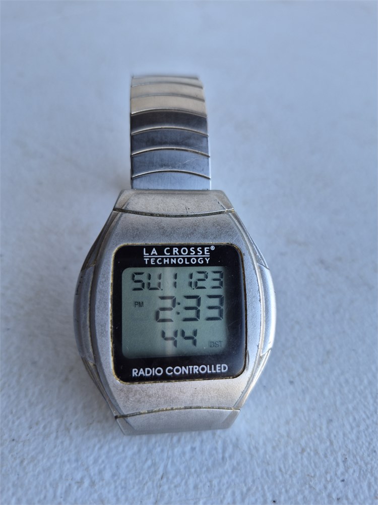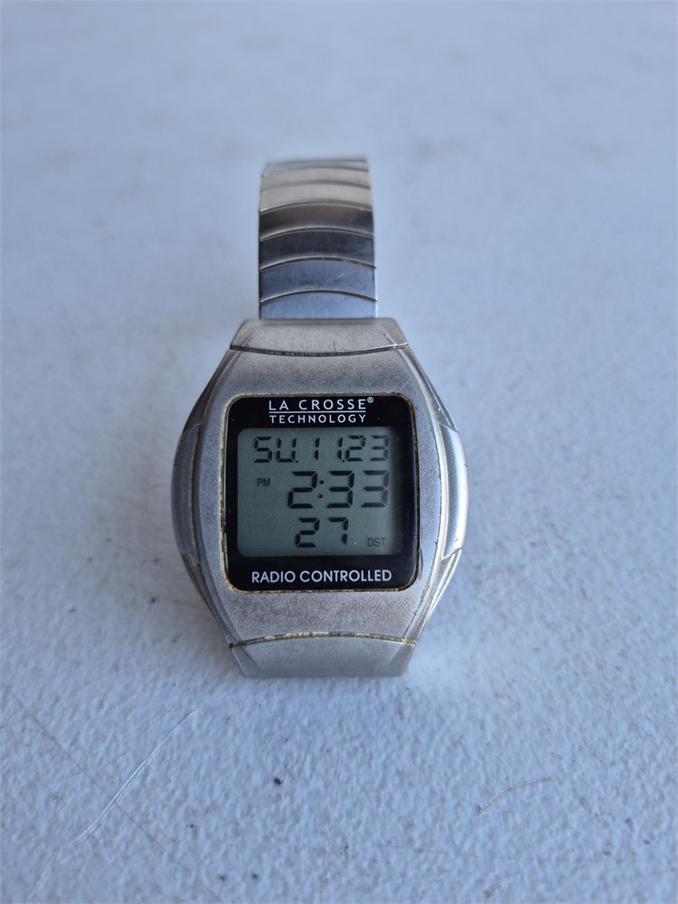 Vintage La Crosse Technology Radio Controlled Men's Digital Watch Silver WT-961. Watch is working.