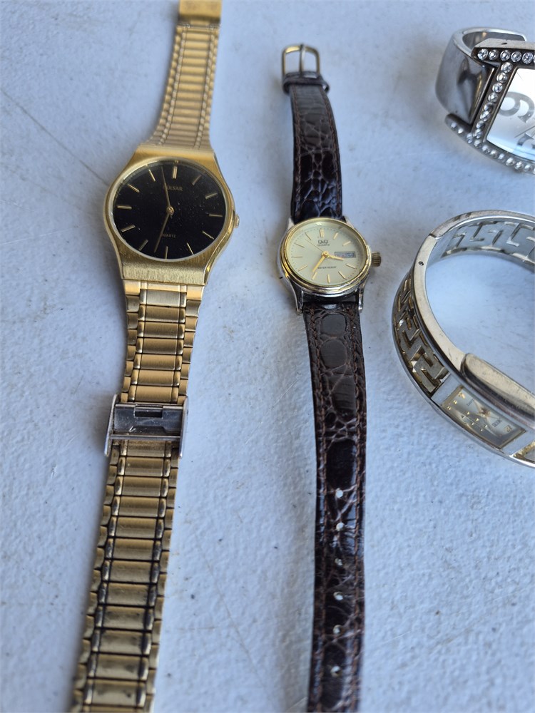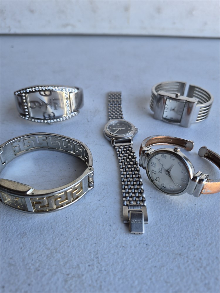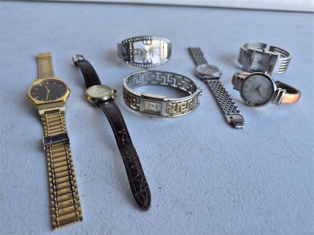 Lot of seven watches include six women's watches and one men's watch. Looks like two of the watches are still working. The other five will need batteries.