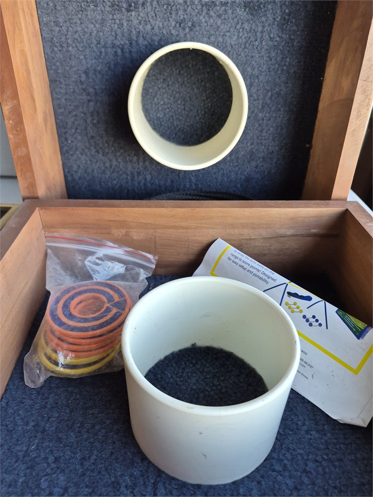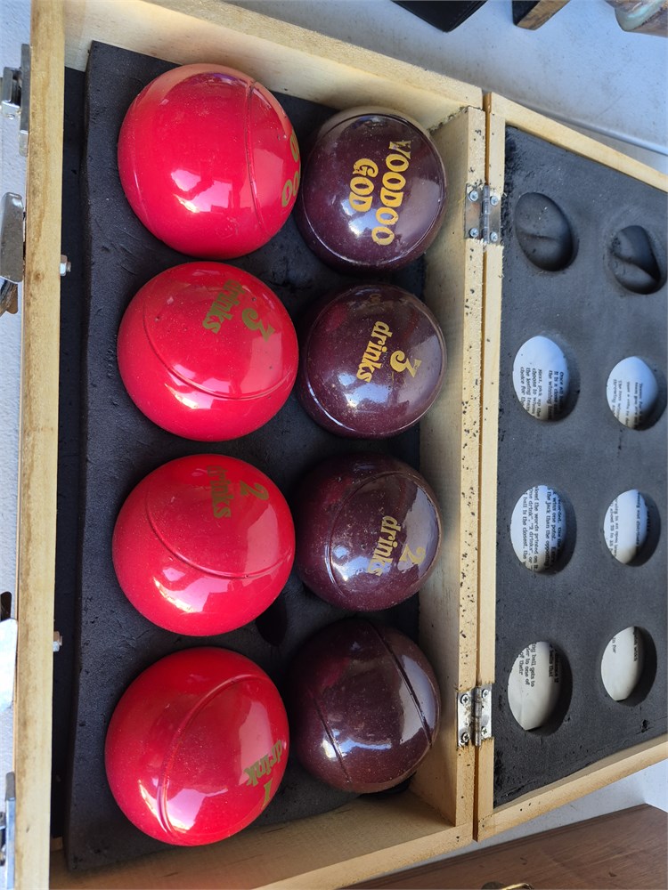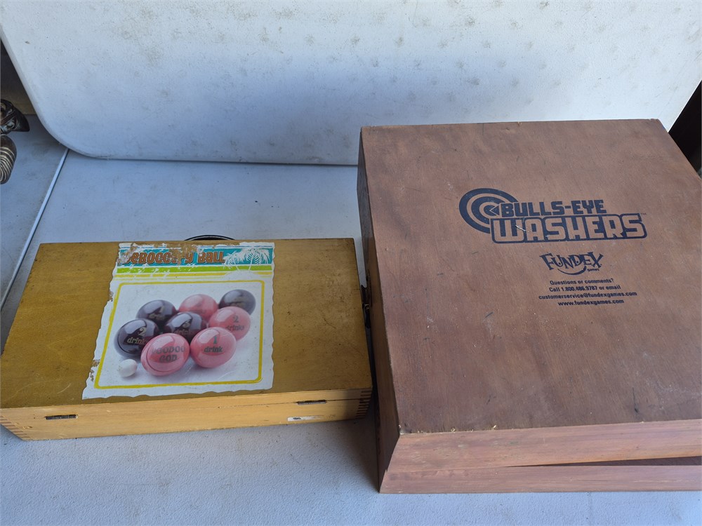 One set of drinking bocce balls and a washer set both come in wood cases. Both look to be in good condition.