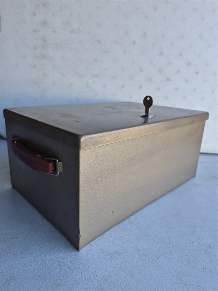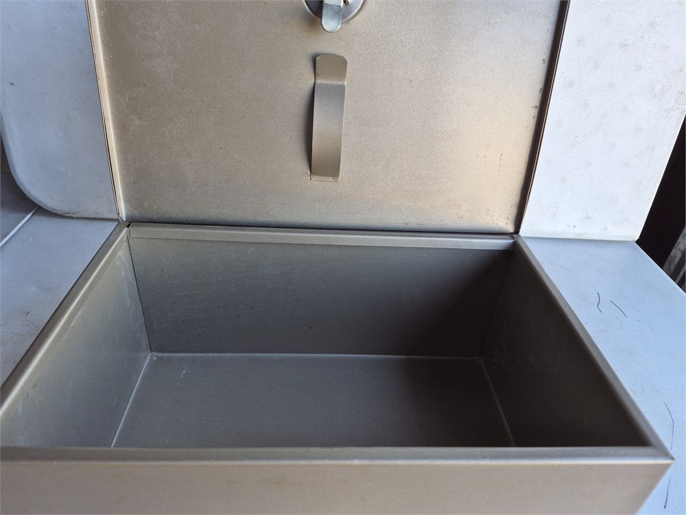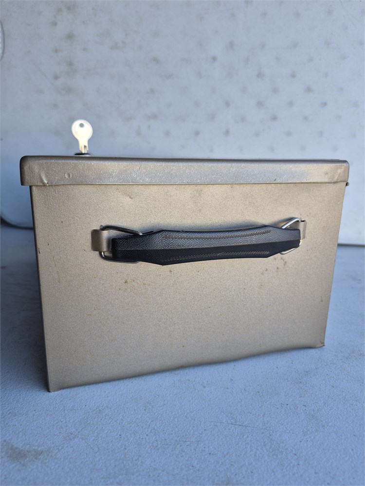 Locking metal box or safe. Good for storing pictures guns ammo etc. Box measures just over 14 inches long 9 in wide and 6 in tall.