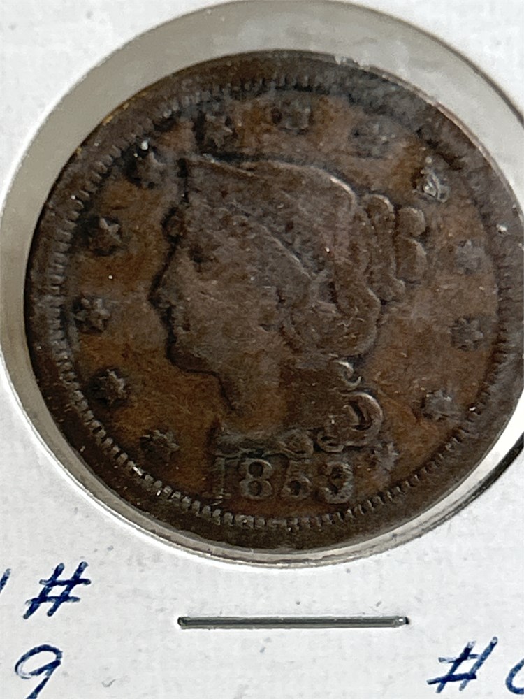 1853 one cent penny very very fine shape very little where