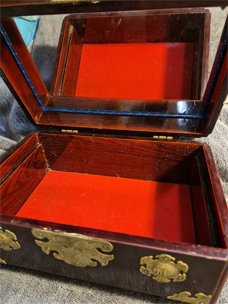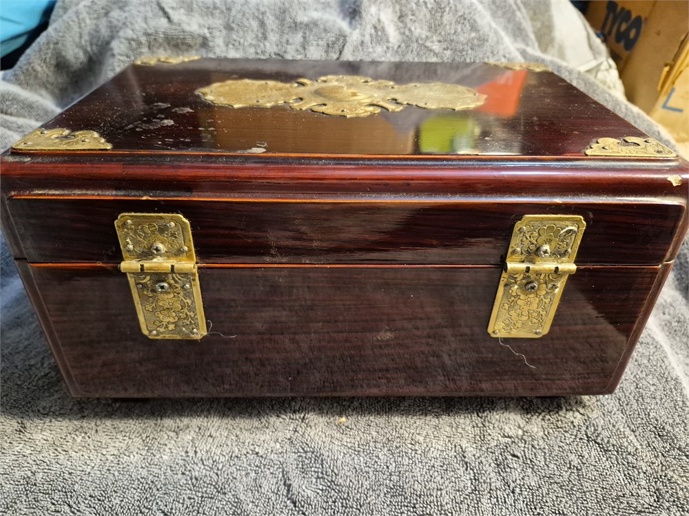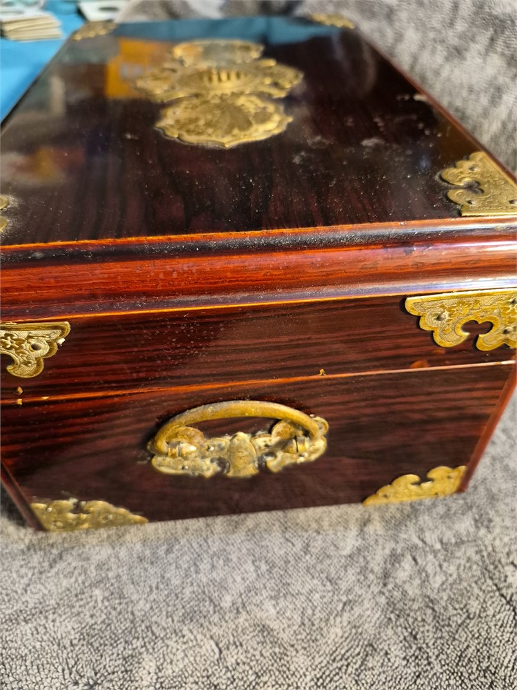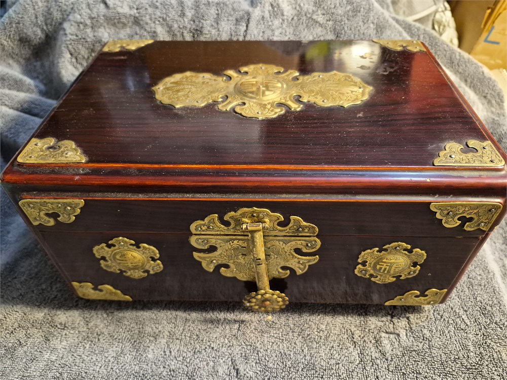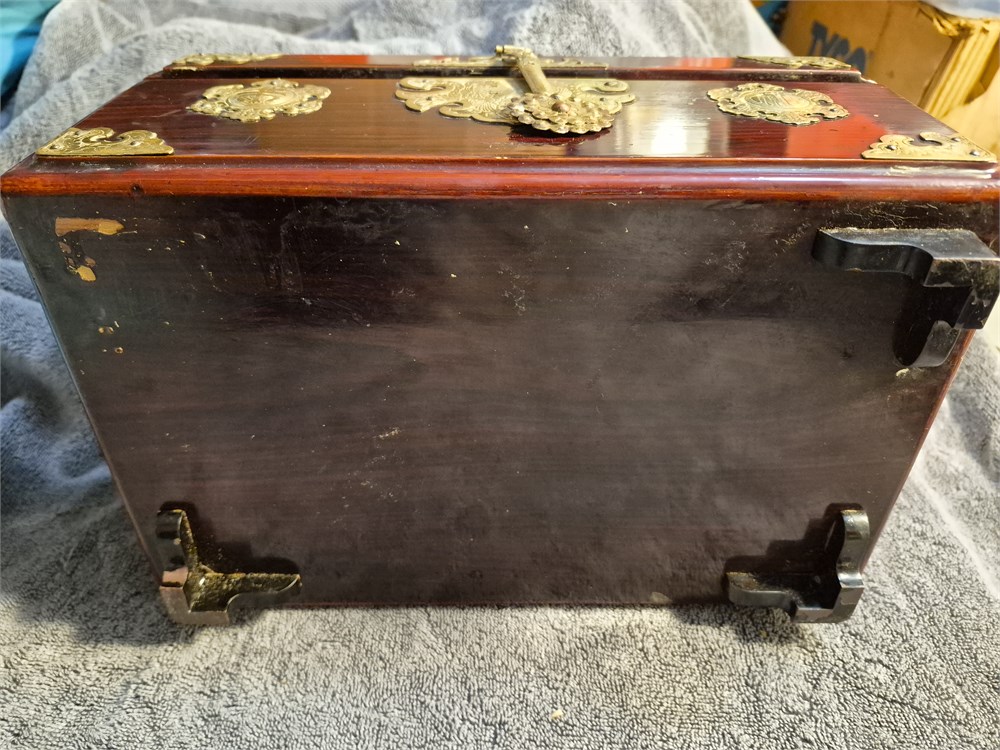 Antique Hwajo Engraved Bronze Ornament Jewelry Box. Box measures 12 in Long 8 in deep and 6 in tall. Box is missing one of the feet.