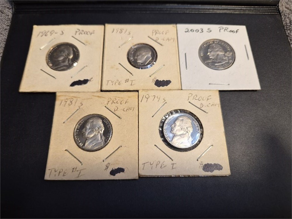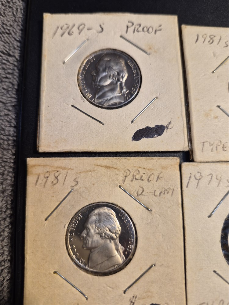 Nice a lot of five proof coins. Includes three nickels 1969s, 1979s and 1981 s. Includes a 1981 s dime and a 2003 S quarter.