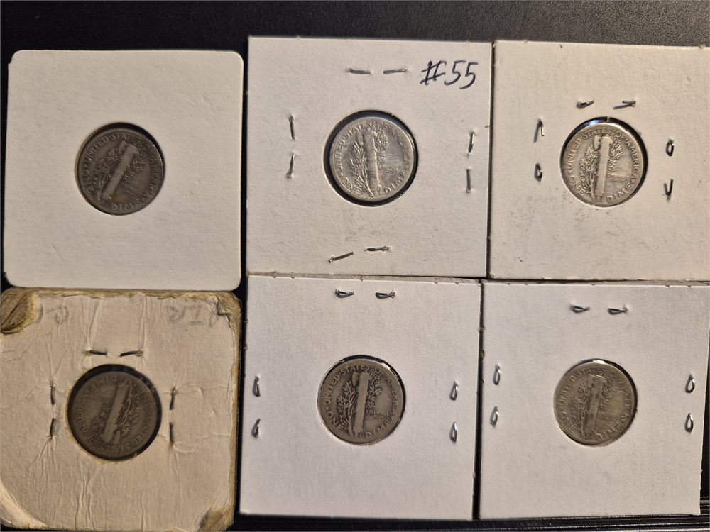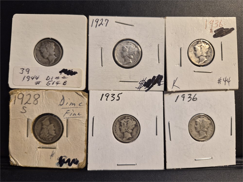 Lot of sex Silver Mercury dimes. Includes 1927, 1928s, 1935, two 1936 and 1944.