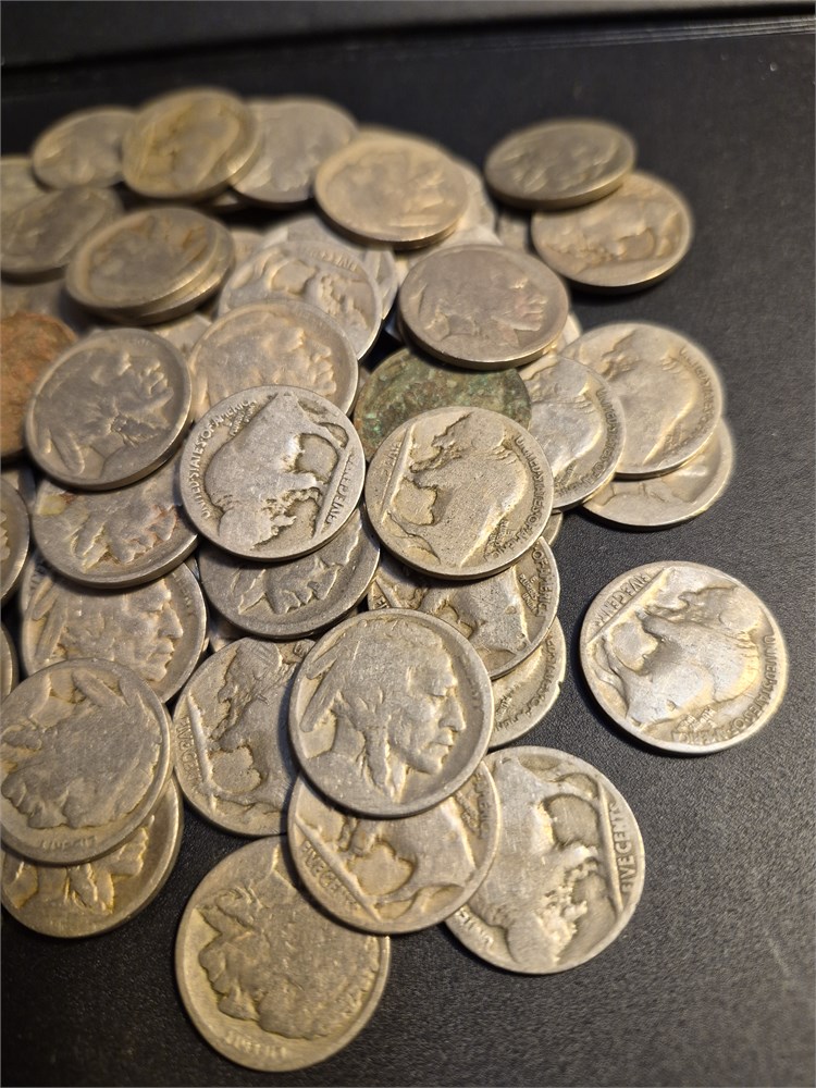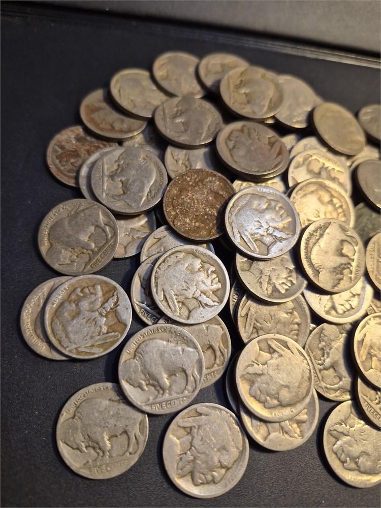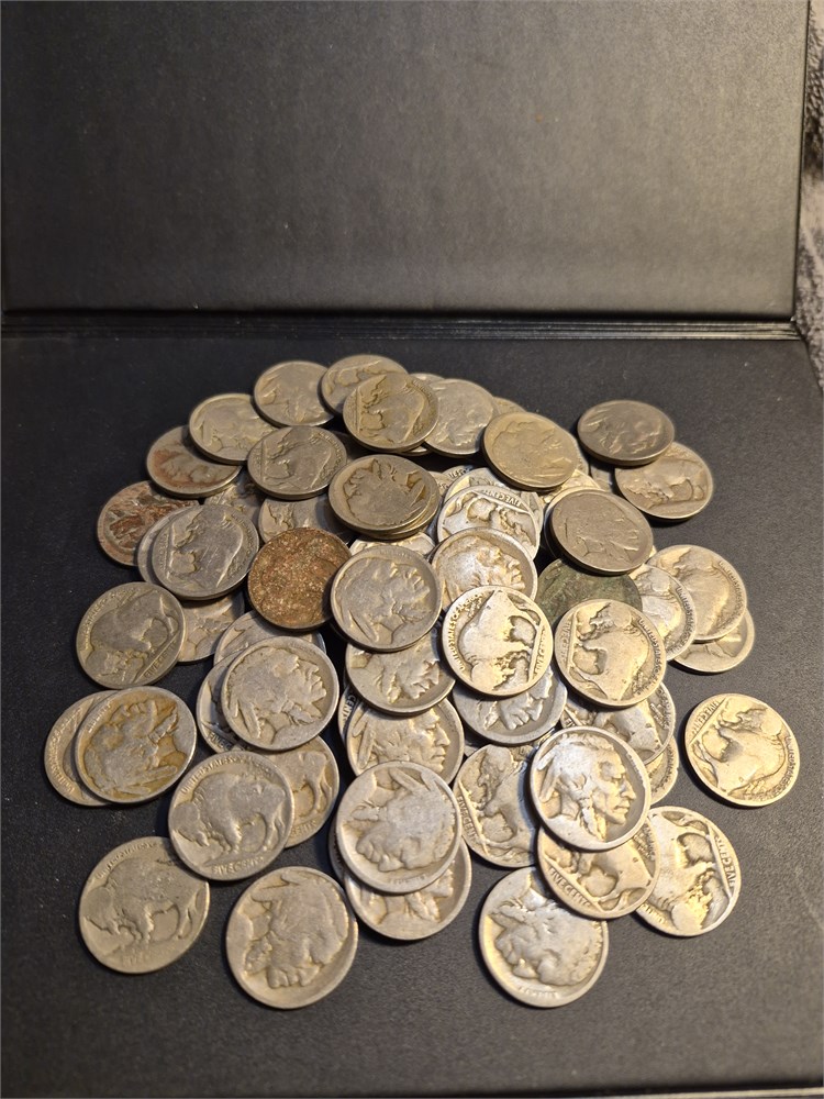 Lot of 93 Buffalo nickels. All nickels are well circulated. And dates are unreadable.