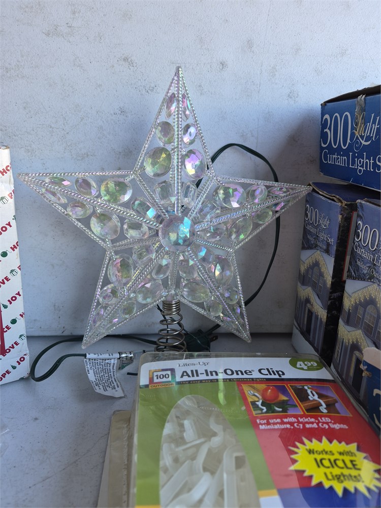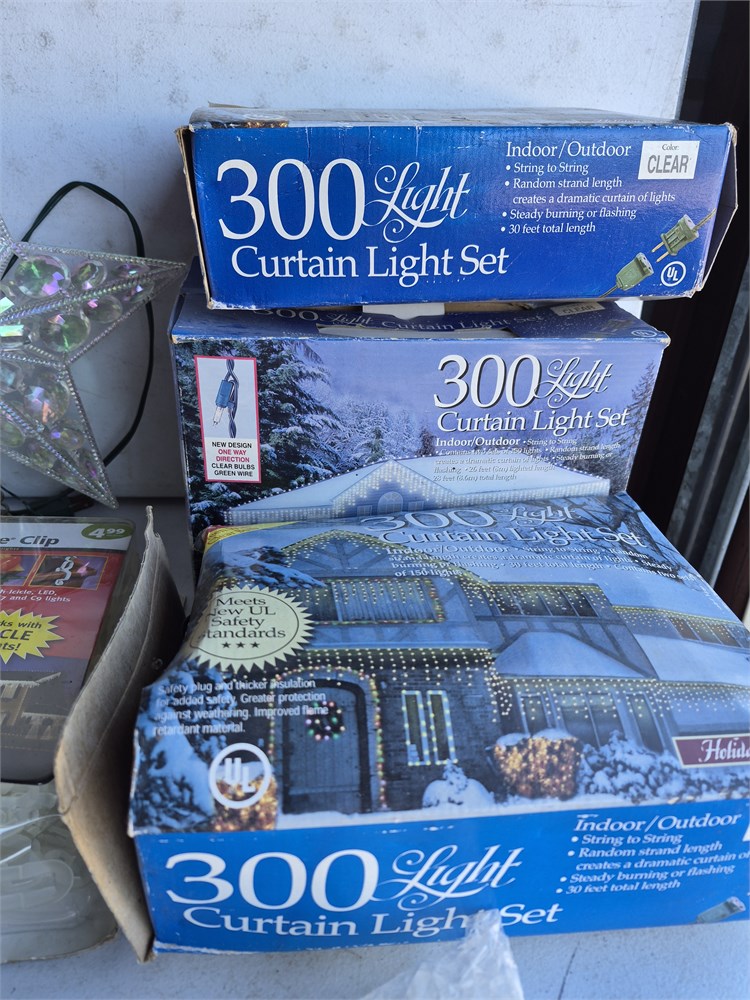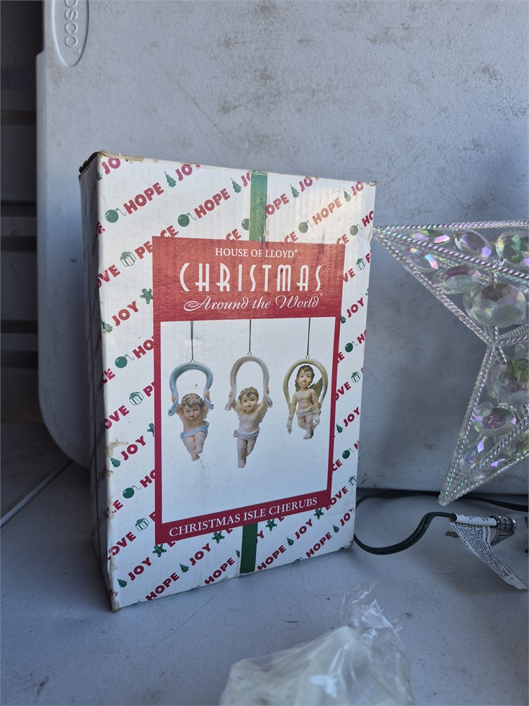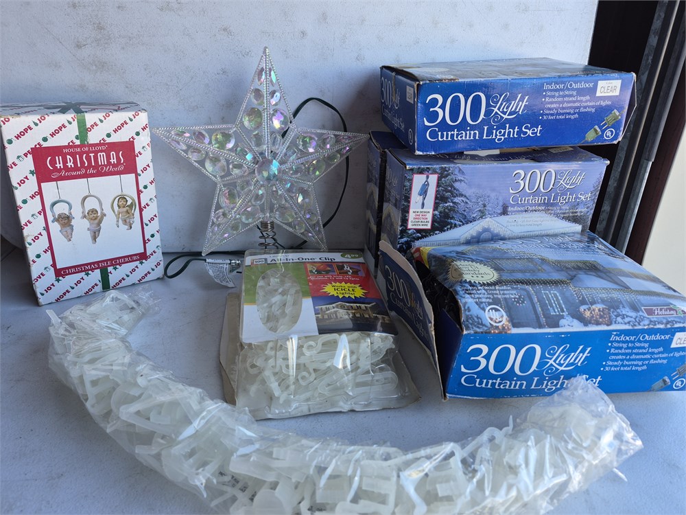 Assortment of Christmas decorations includes four boxes of curtain lights. Also includes clips for hanging House of Lloyd Christmas Around the World cherubs and a tree topper.