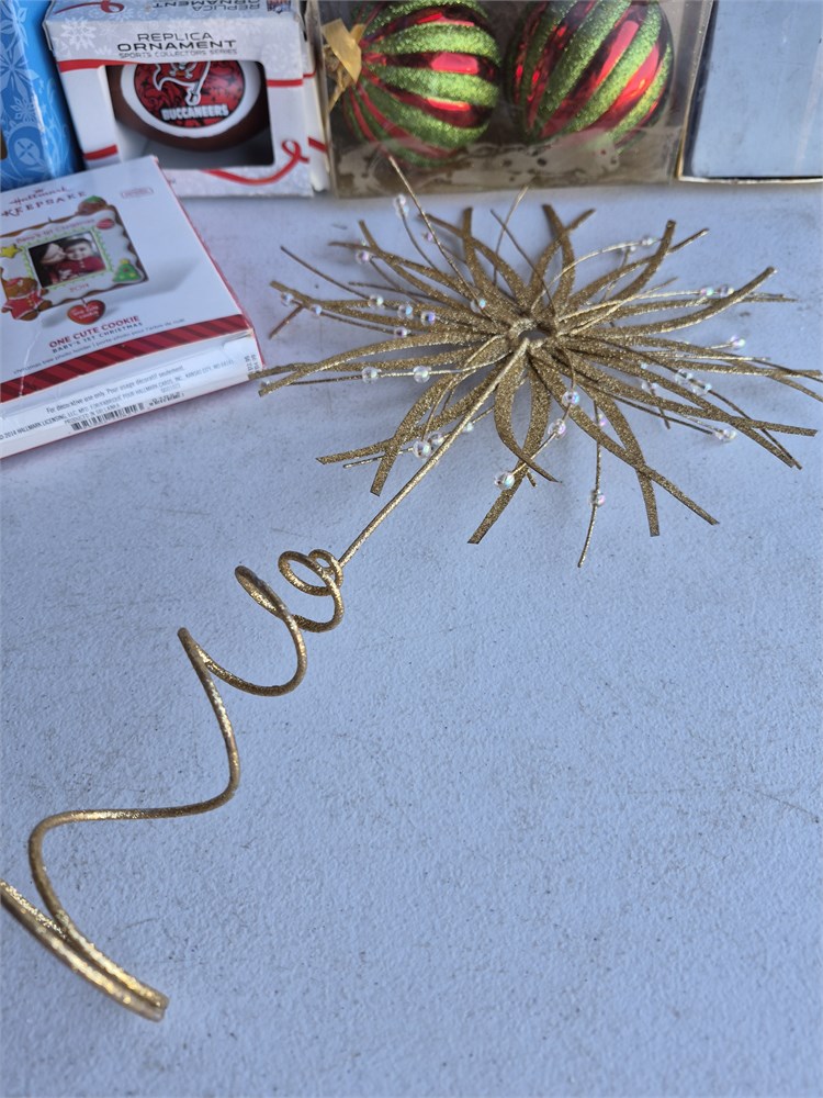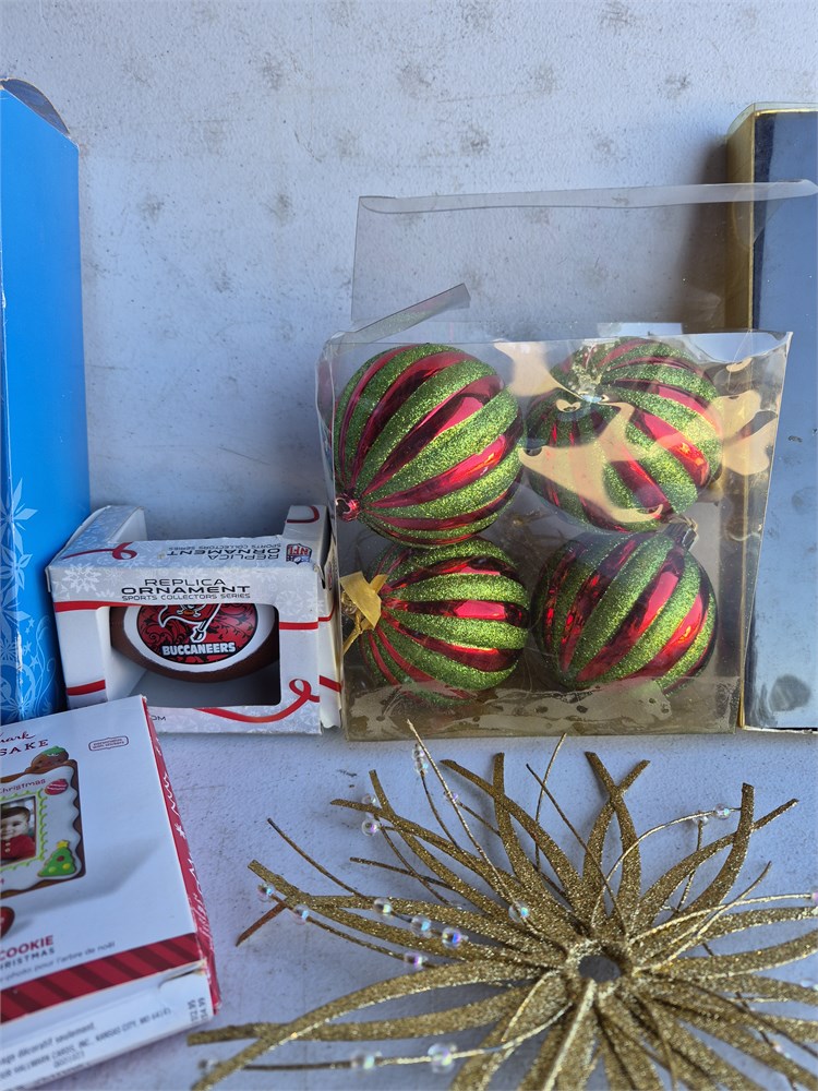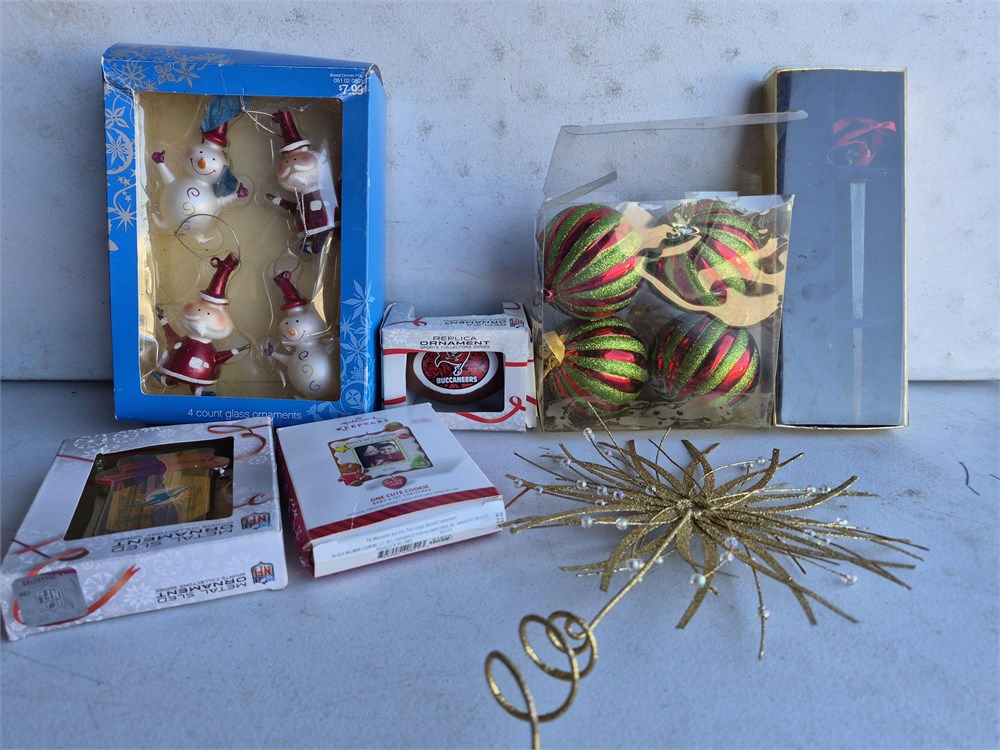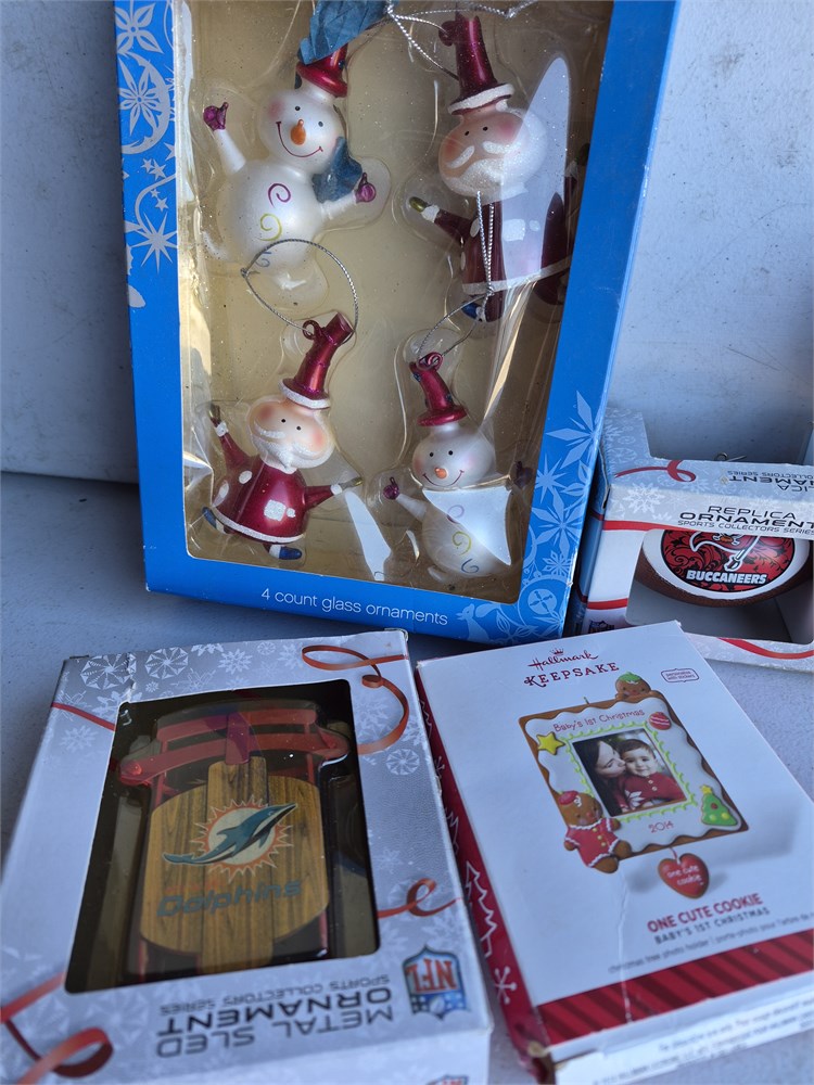 Nice lot of Christmas ornaments. Includes Miami Dolphin and Tampa Bay Buccaneer ornaments. Also Santa Claus and snowman and a few others.