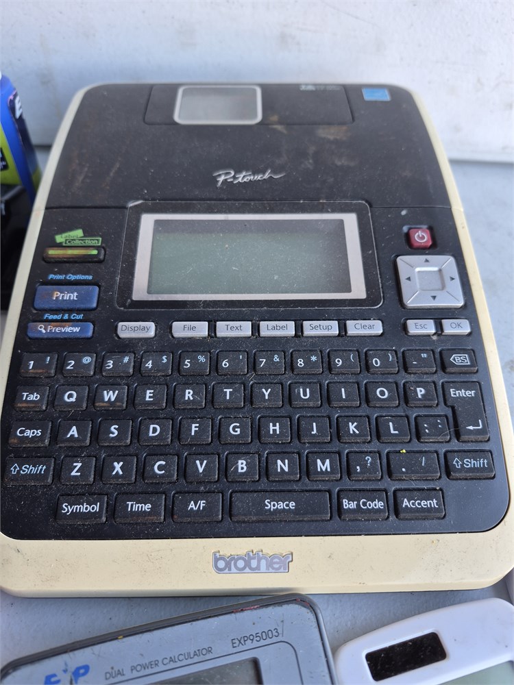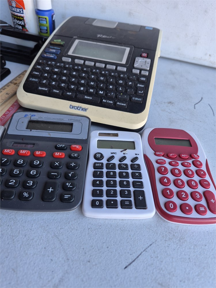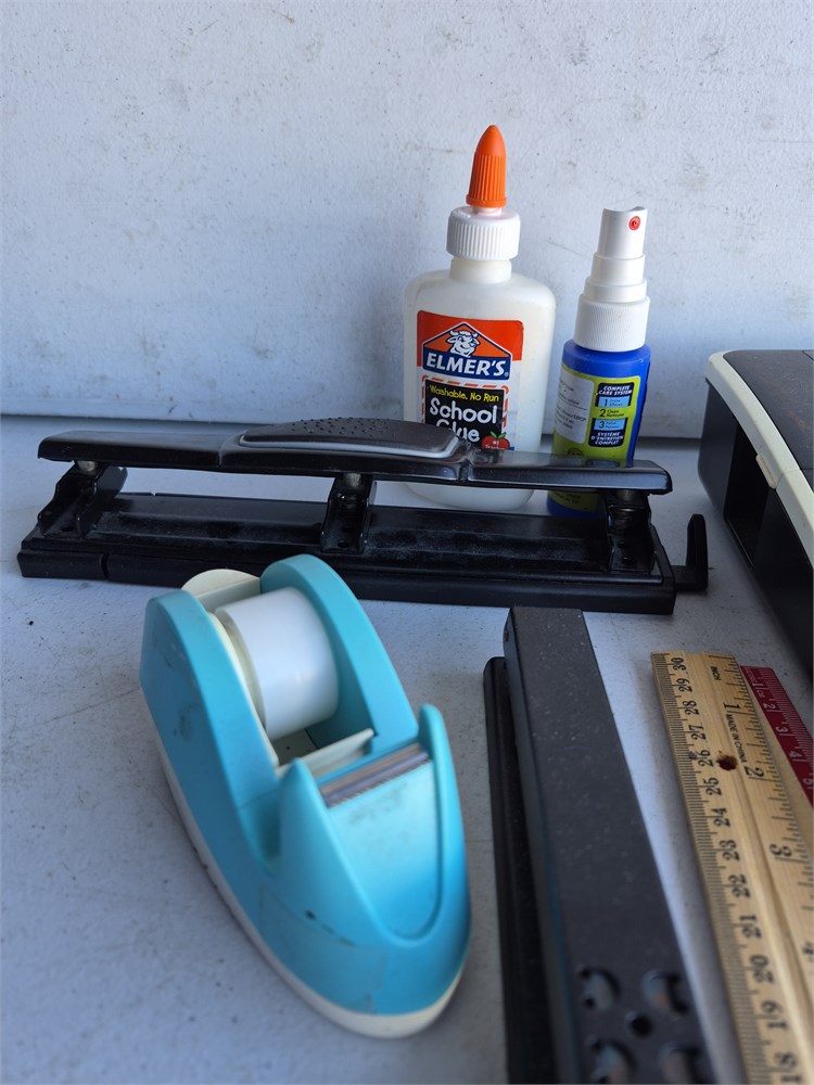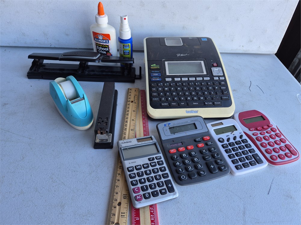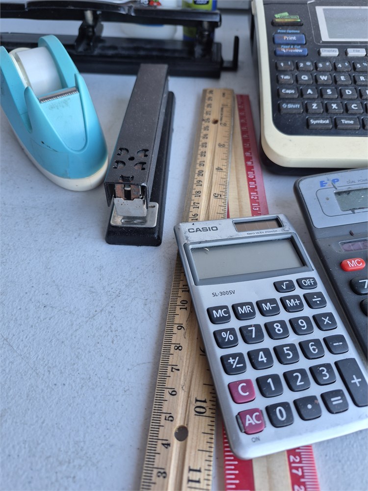 Small lot of office supplies. Includes calculators stapler tape dispenser hole punch rulers and other items.