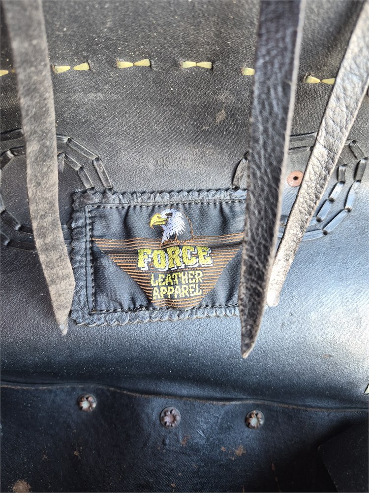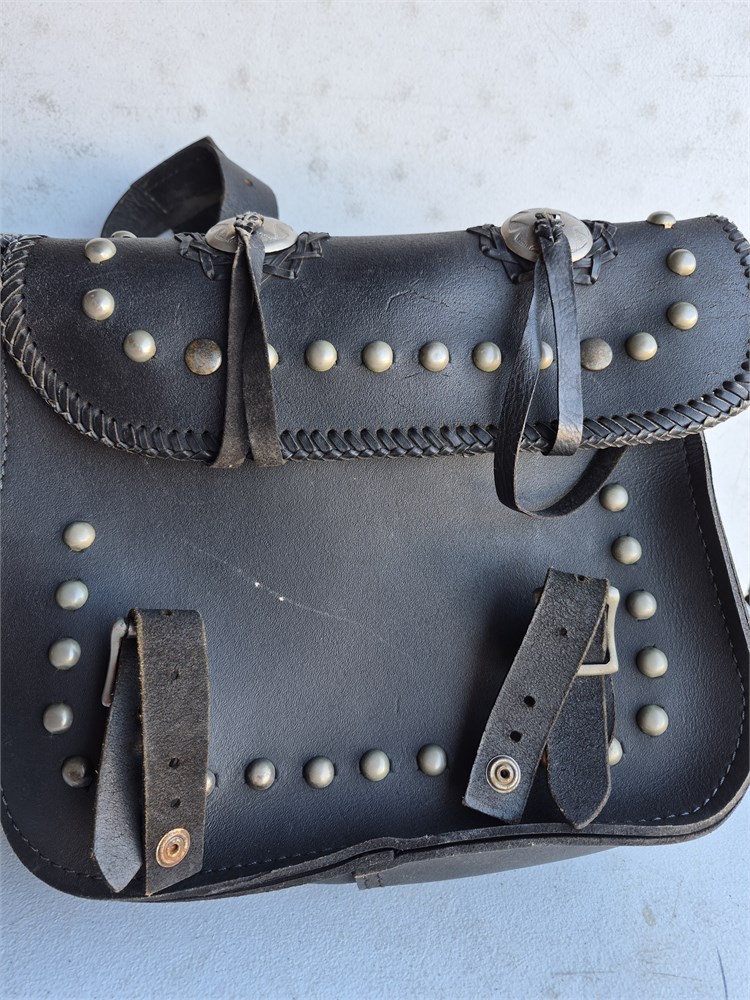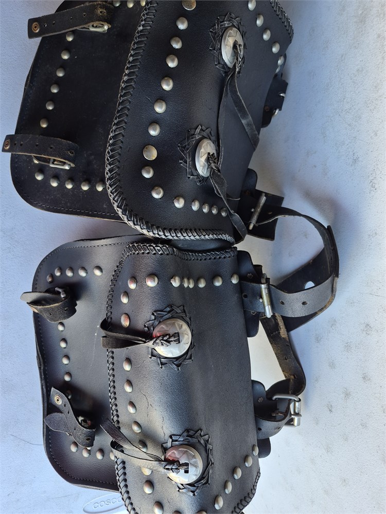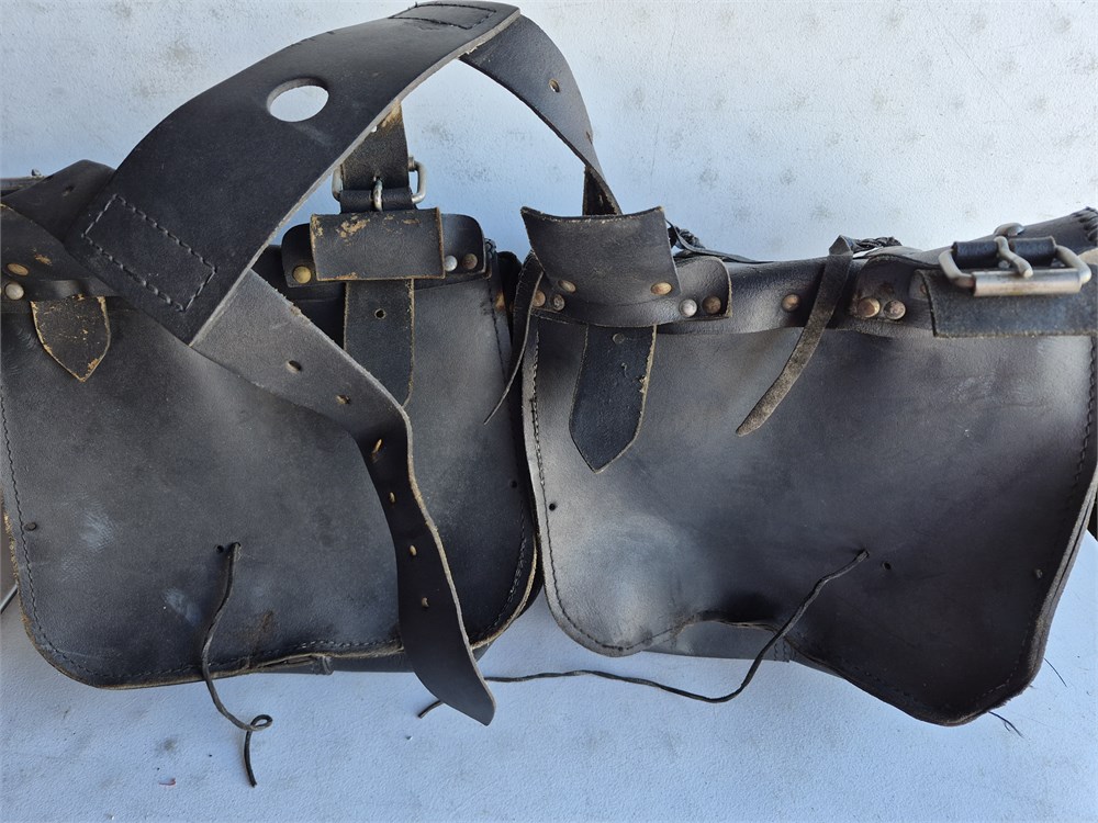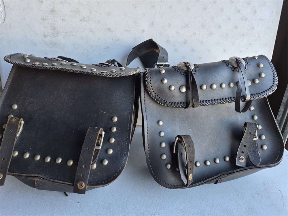 Set of leather saddlebags by force leather gear. Bags measure 10 in tall by 13 in wide and 5 and 1/2 in deep.