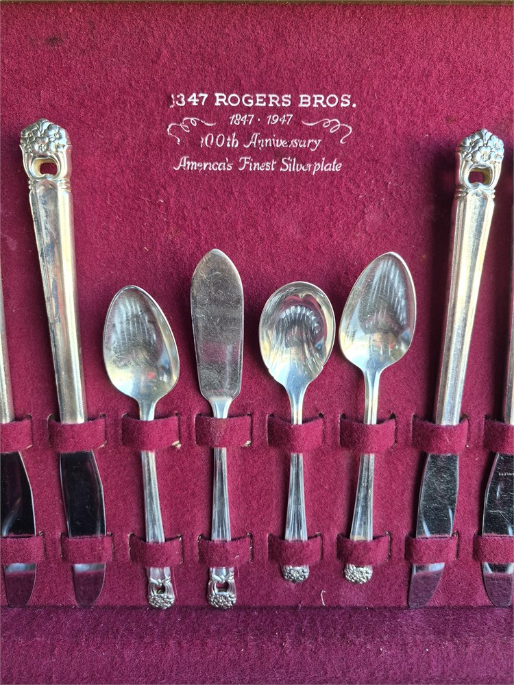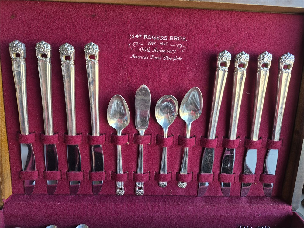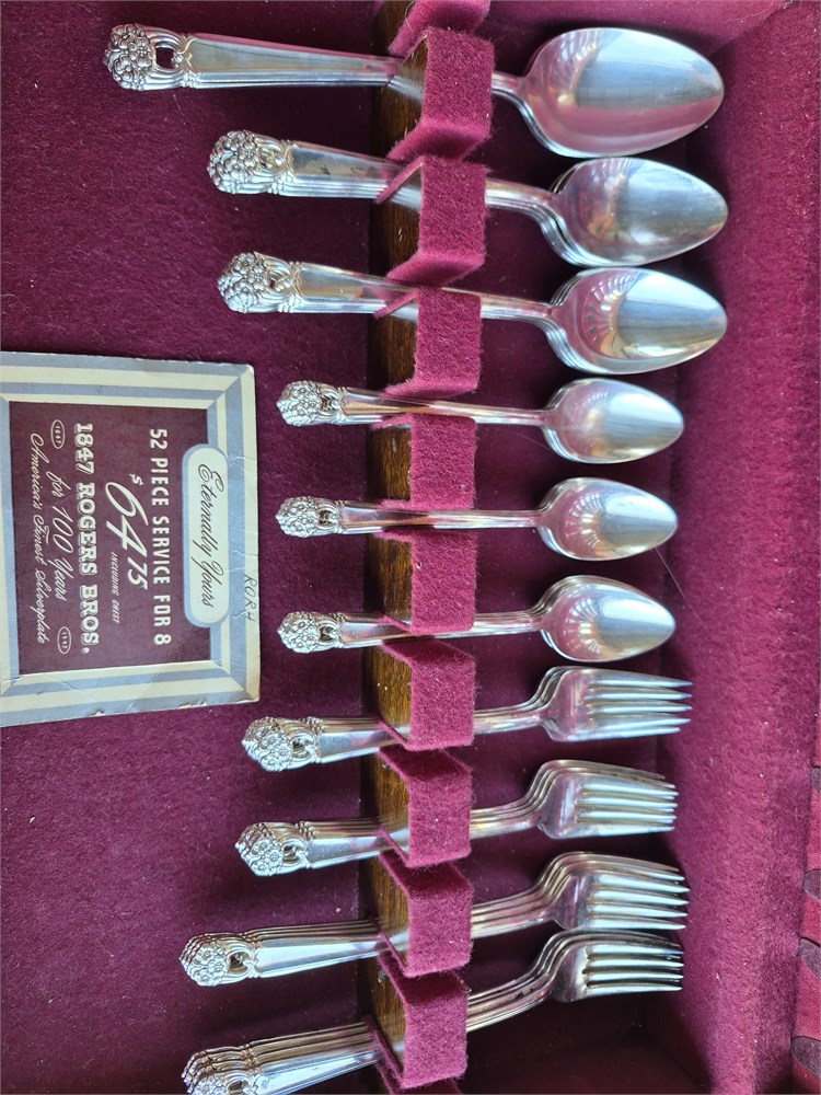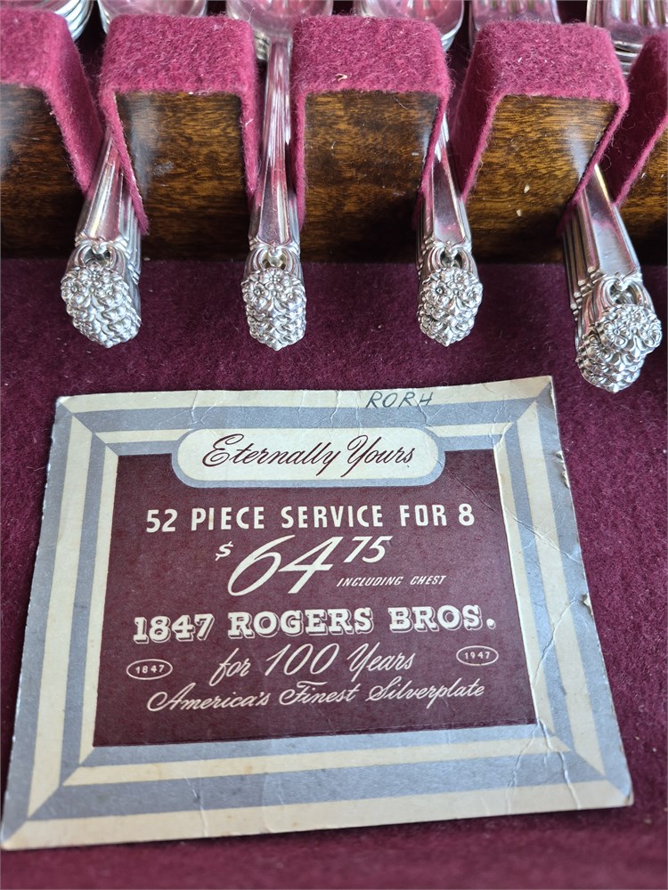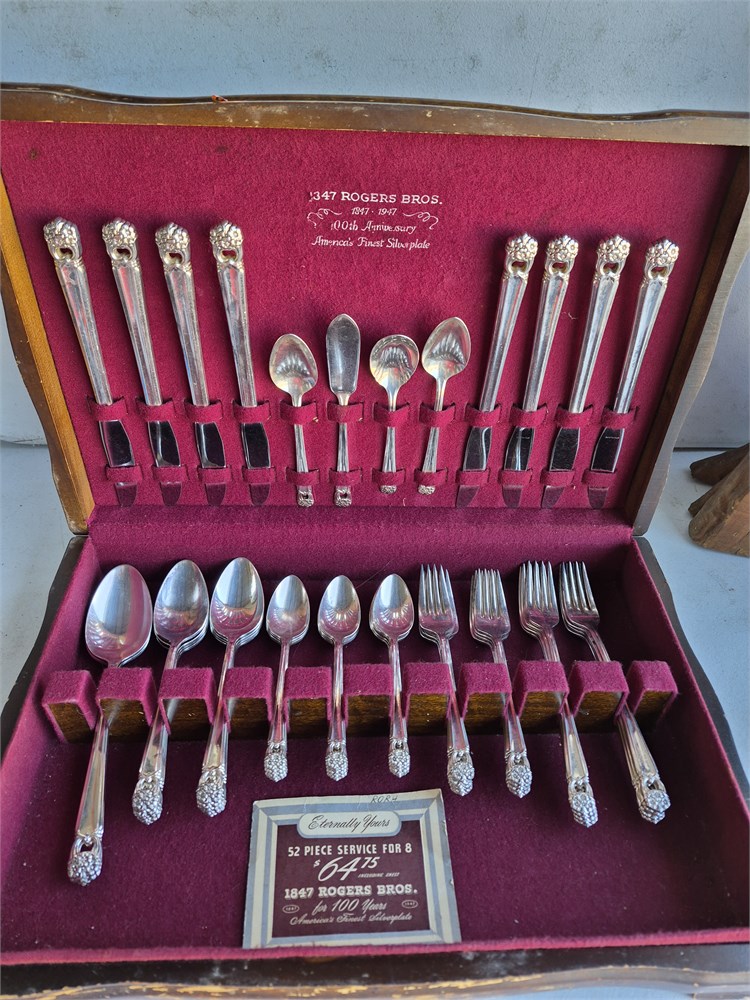 1847 Rogers Brothers eternally yours plated silverware set. This is 100th anniversary set. Original set had 52 pieces there is still 50 pieces included here. Comes in original box. Box definitely show signs of age.