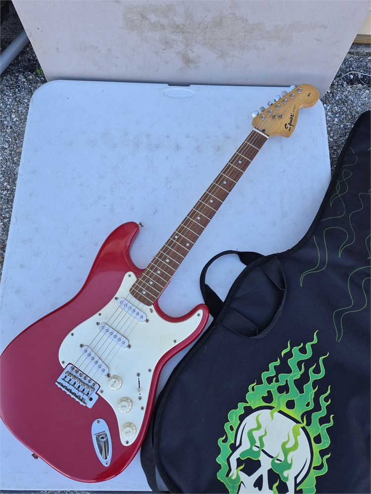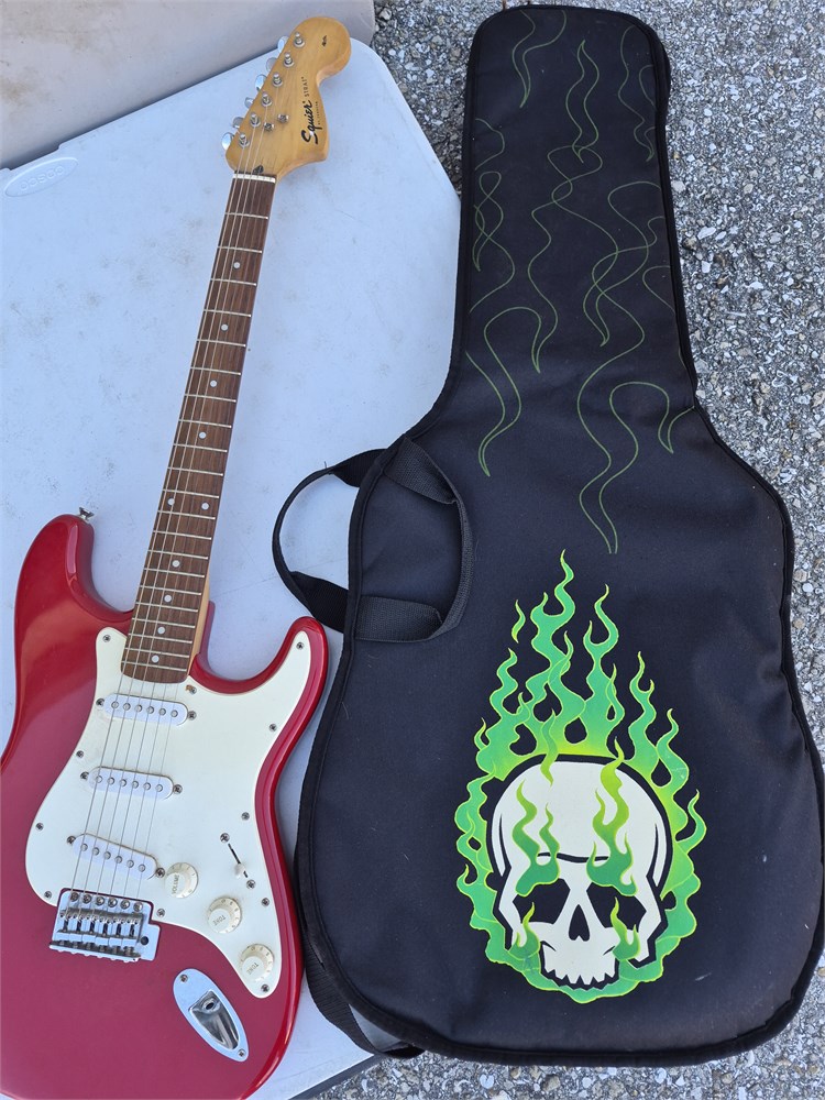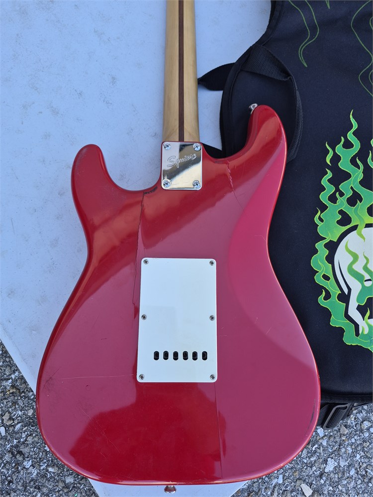 Used Electric Squier Strat by fender. Comes with soft case. Guitar has two cracks on back.