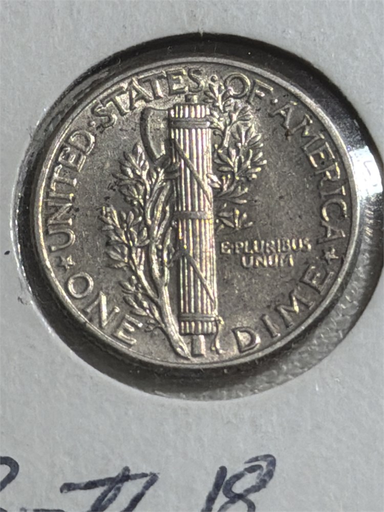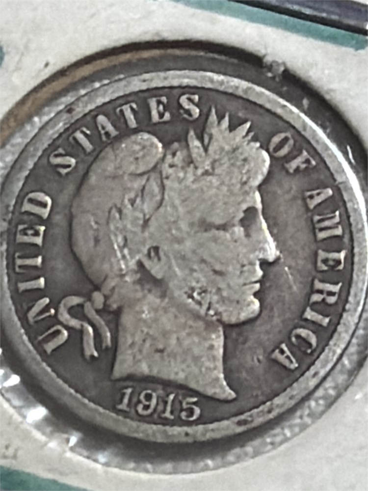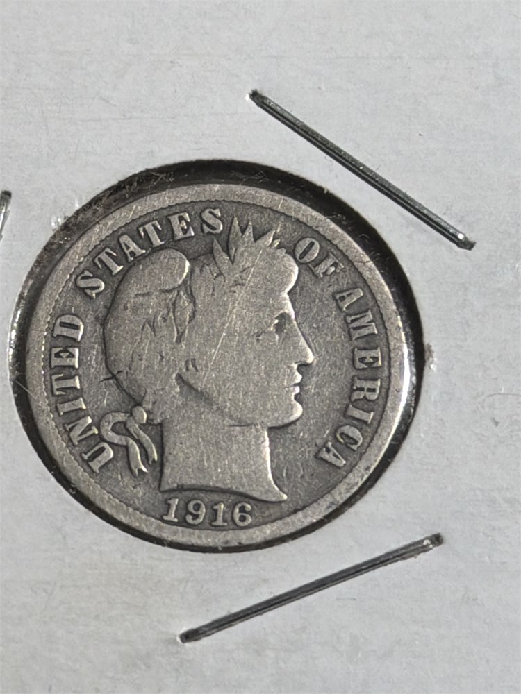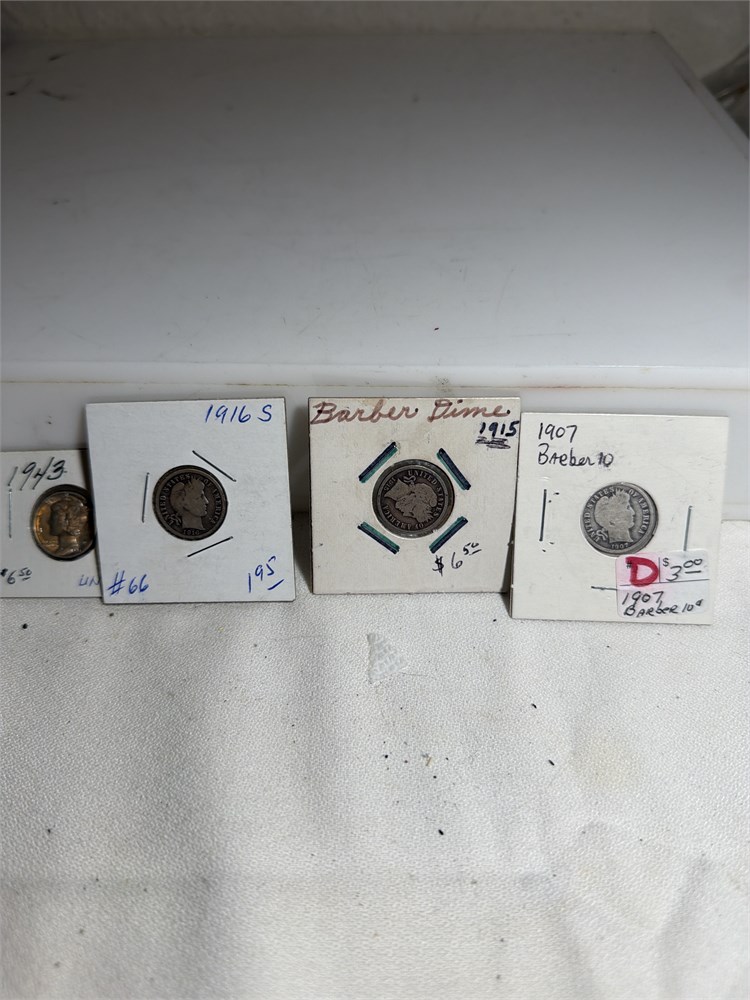 4 barber dimes in cards, 1943, 1916 S, 1915, 1907 all in very nice shape