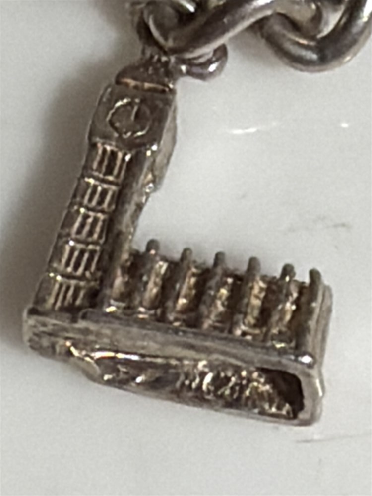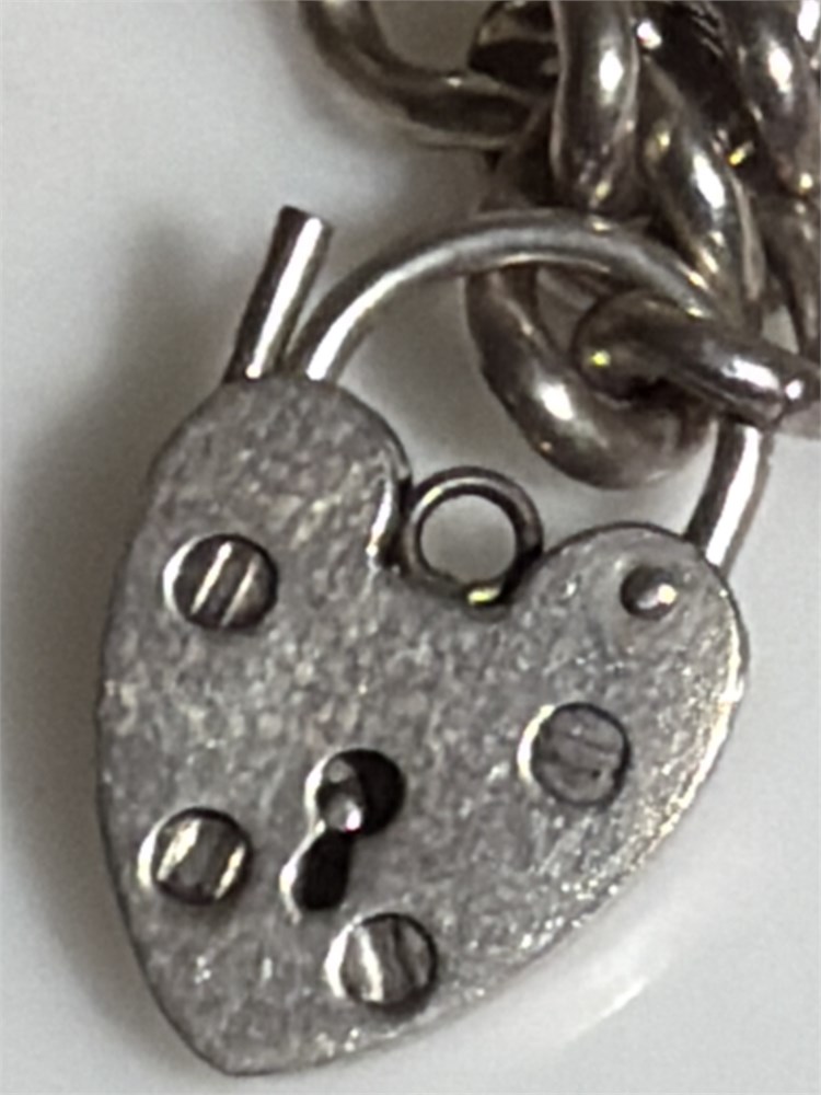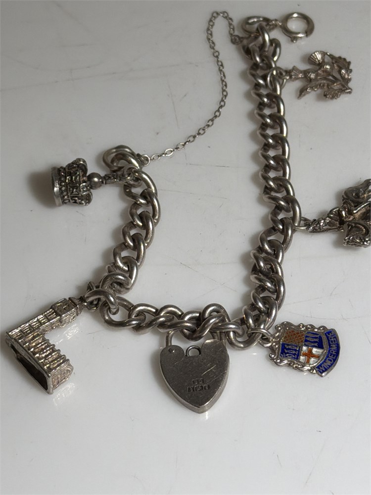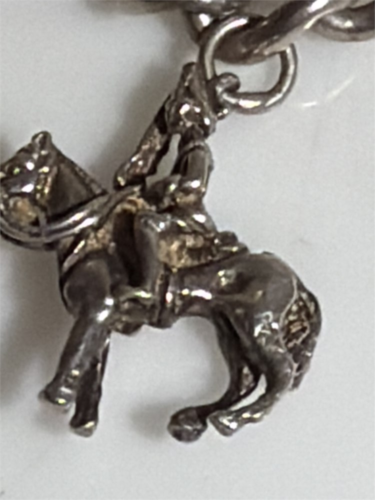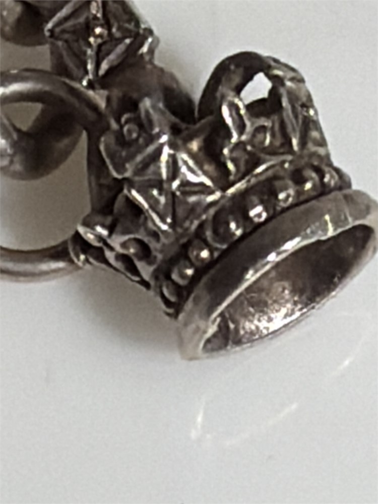 925 Sterling silver bracelet and charms padlock charm Night on horse, charm Kings Crown, end war and more