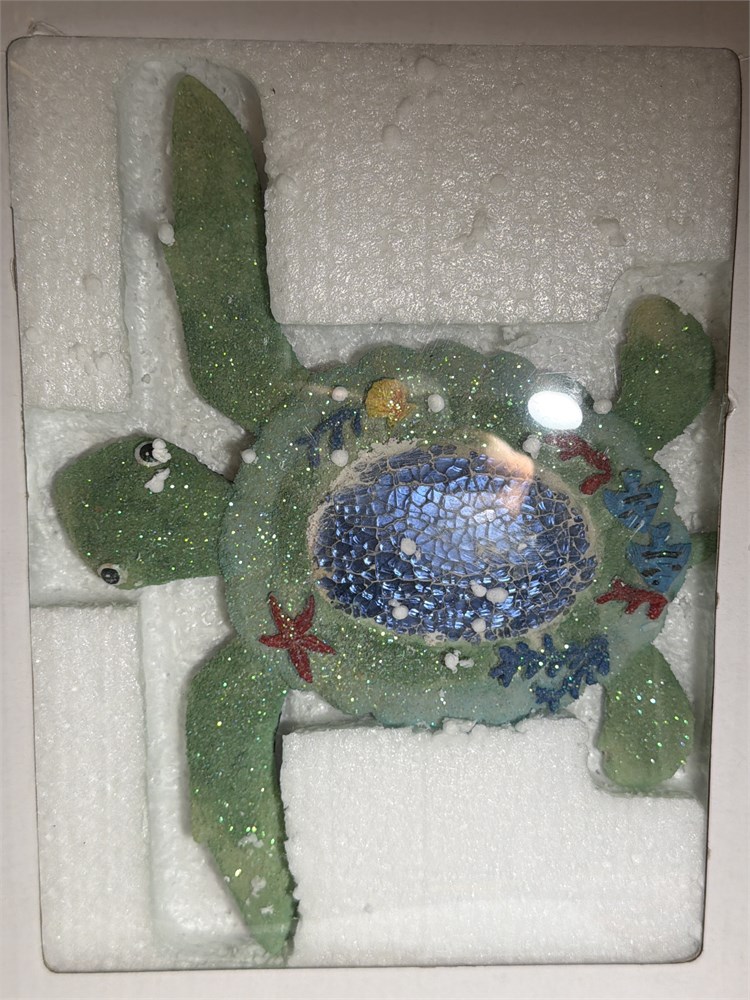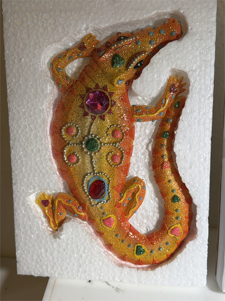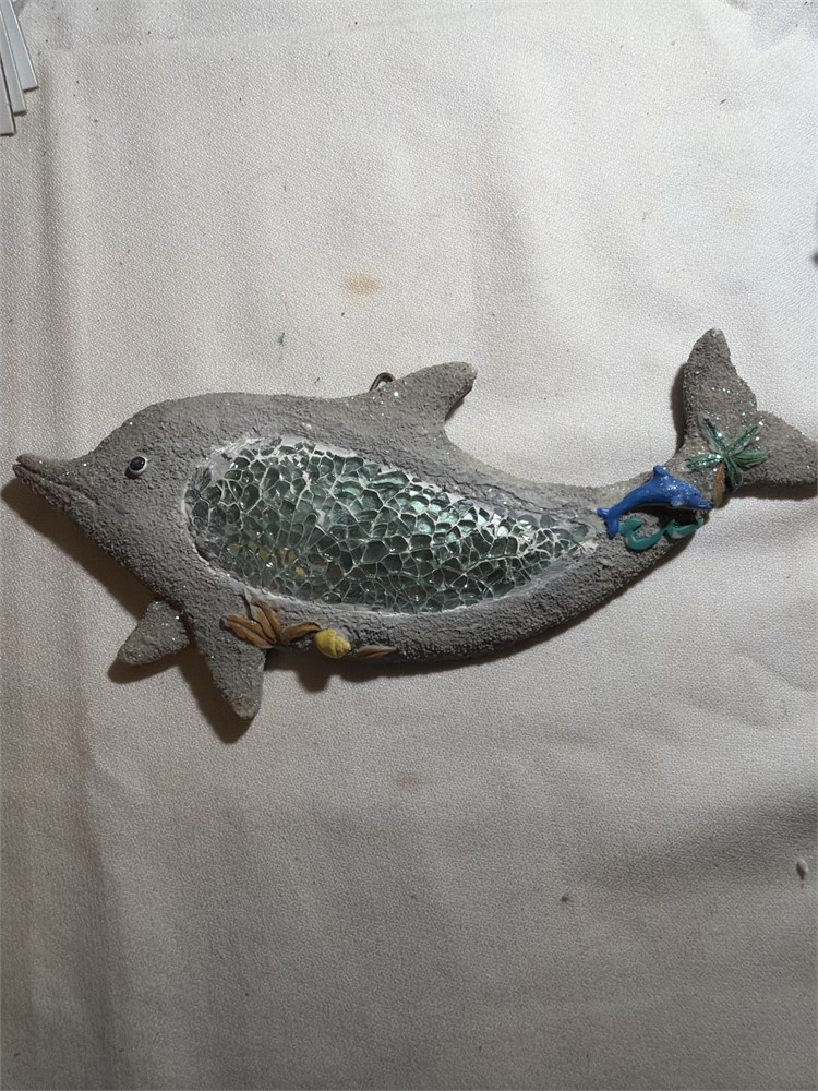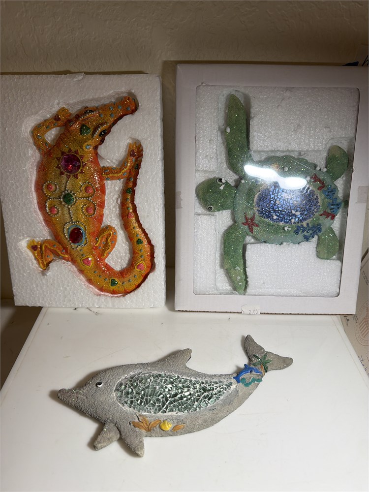 Ceramic gator 8“ x 5“ dark orange yellow with costume stones in have a sea turtle 8“ x 6“ ceramic absolutely beautiful also last but not least we have a dolphin 8“ x 3 1/2“ green and gray wall hangers or bathroom sink they all come in original boxes