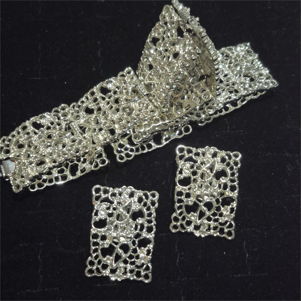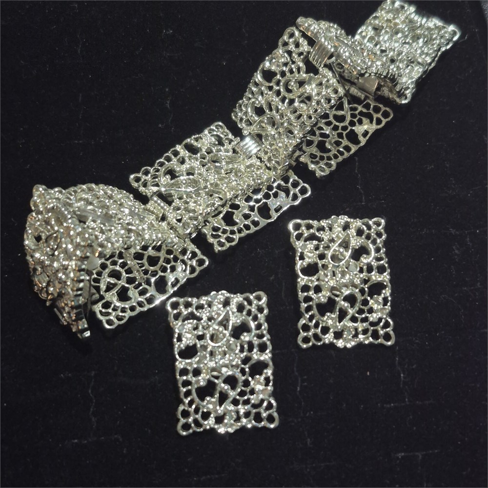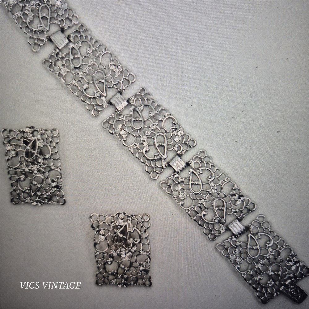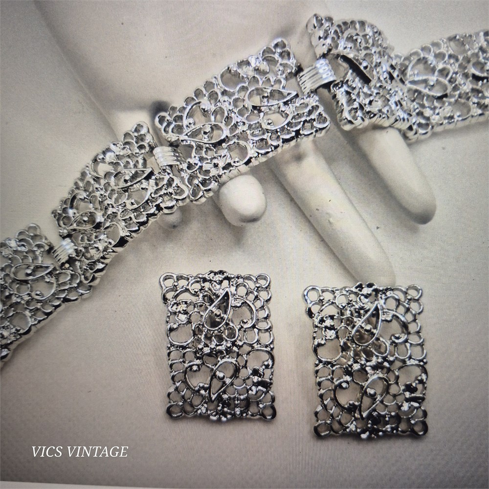 Vintage Silver Tone Filigree Panel Link Bracelet & Matching Clip Earrings [VC]