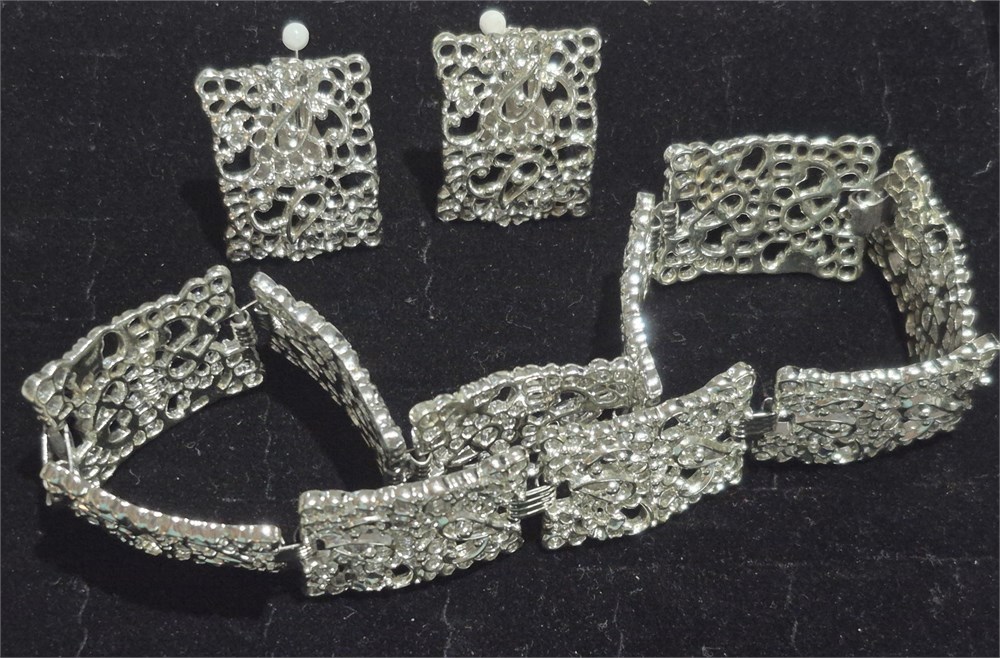 Vintage Silver Tone Filigree Panel Link Bracelet and Matching Earrings Set. The bracelet is marked Emmons. The earrings are marked EMJ. The set was from their "Frosted Lace" collection circa 1960.