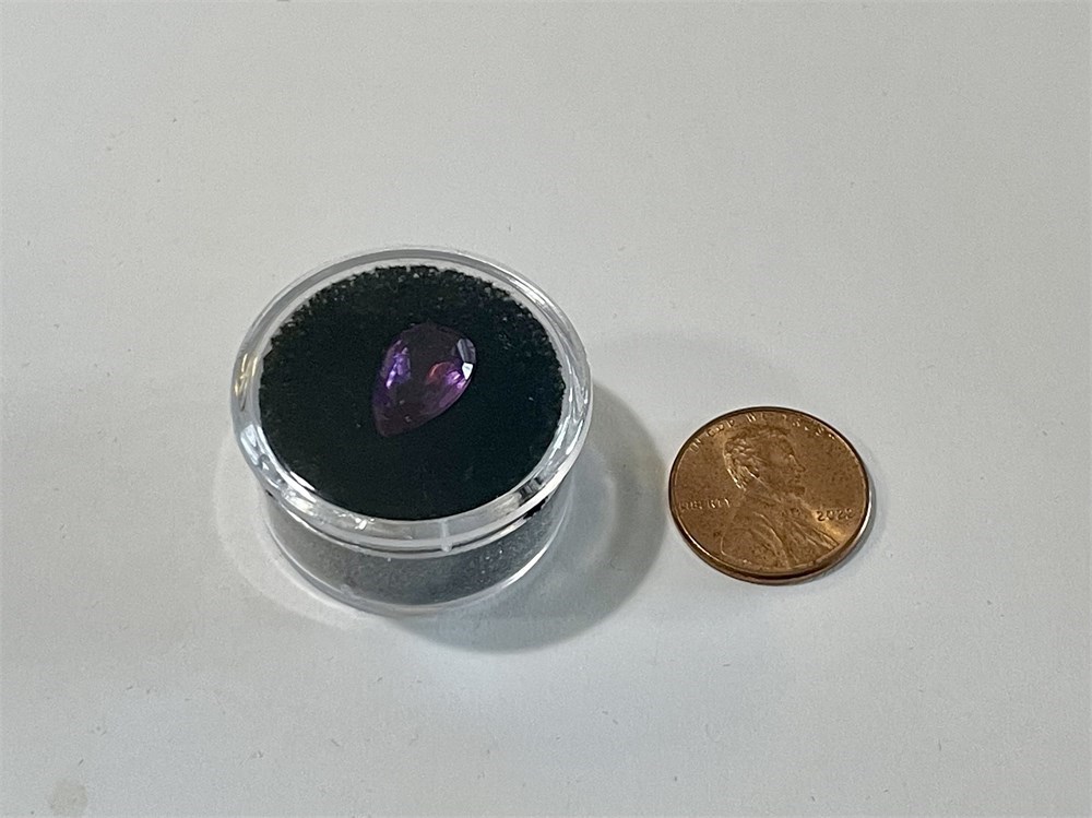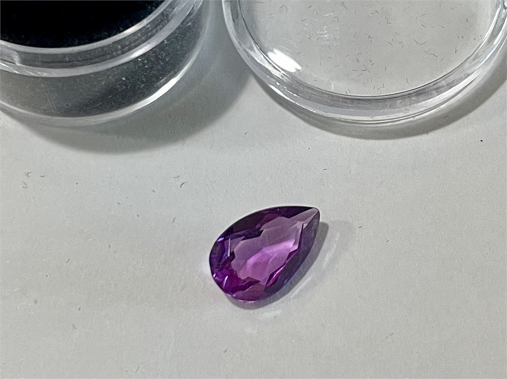 A teardrop cut gemstone (likely amethyst, lovely purple color), carefully removed from gold jewelry and in good condition.