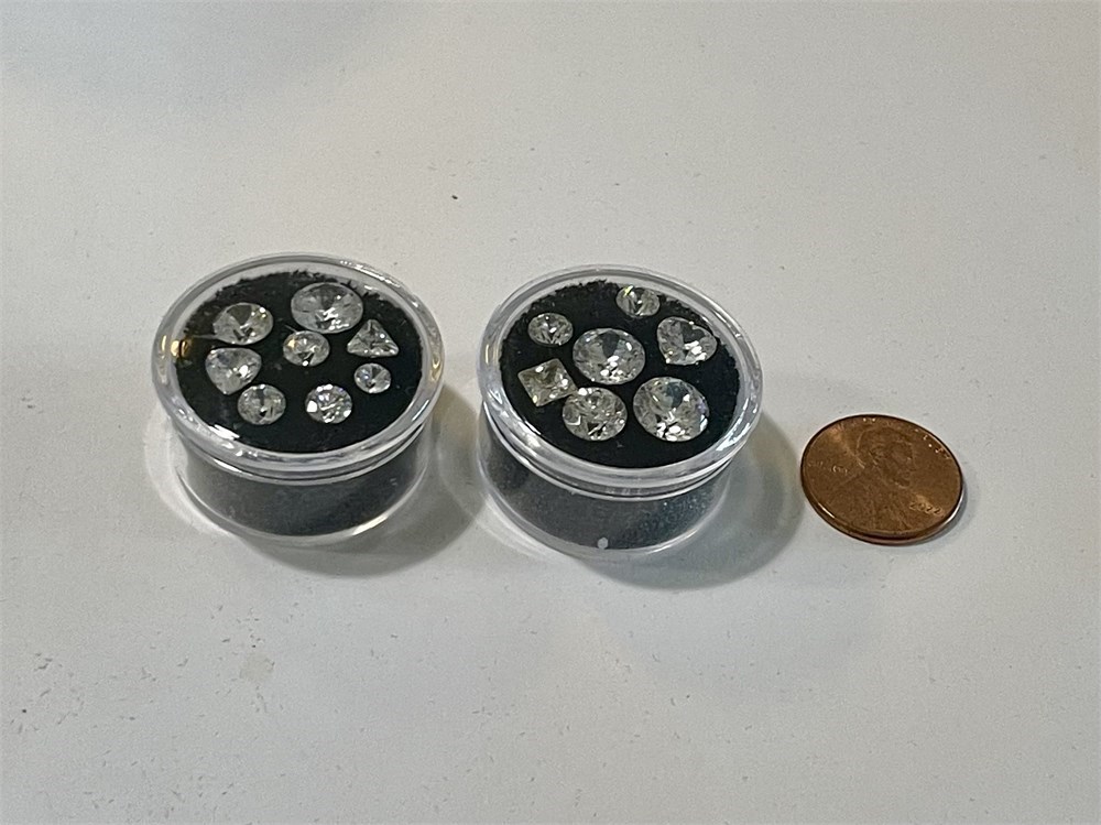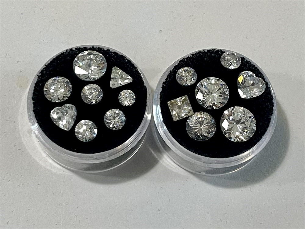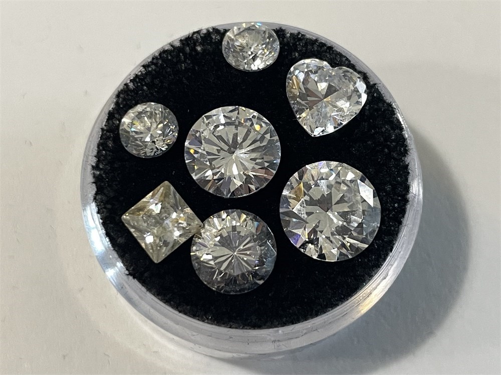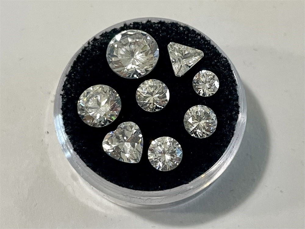 Assorted white gemstones taken from gold jewelry, unidentified.  Some are quite sizeable.  Shapes include round, square, triangle, and heart.