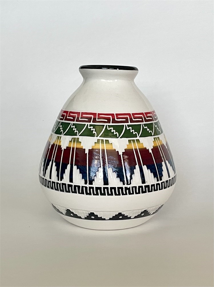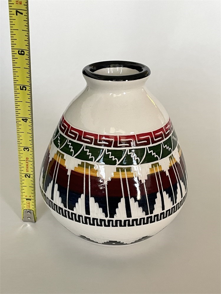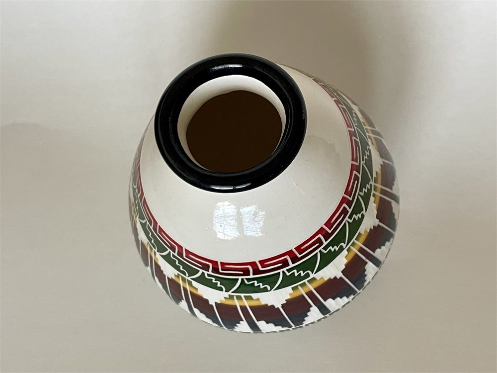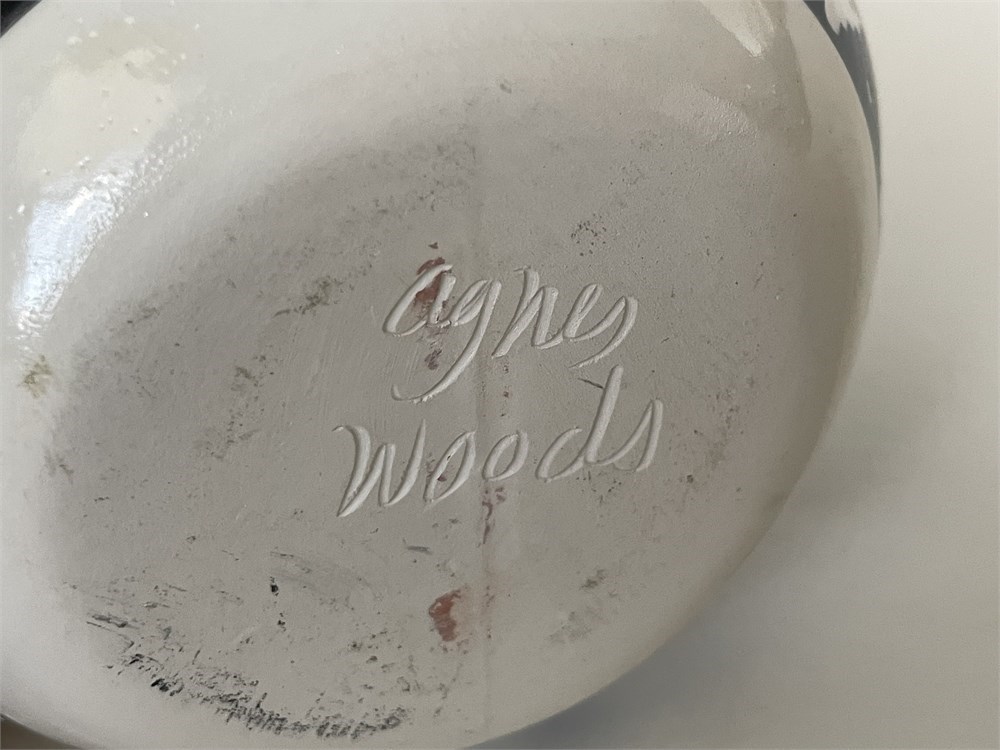 Modern Native American glazed pottery by artist Agnes Woods, signed on the bottom.  5 1/2" tall, no damage.