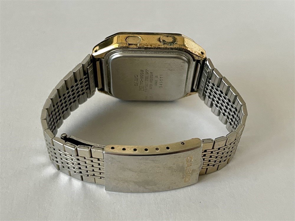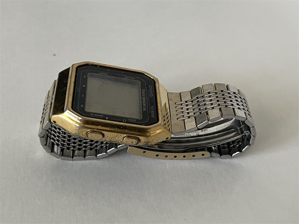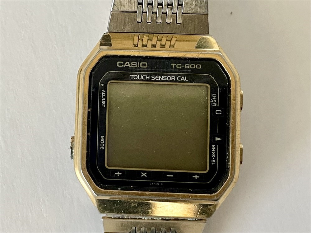 A cool retro men's watch, an early touchscreen by Casio.  Numbered TC-600G on the back.  It will need at least a battery; hopefully with some TLC it will work for you.  We haven't tried it.