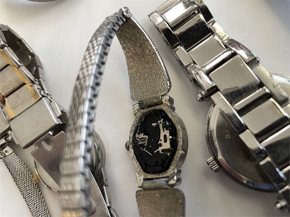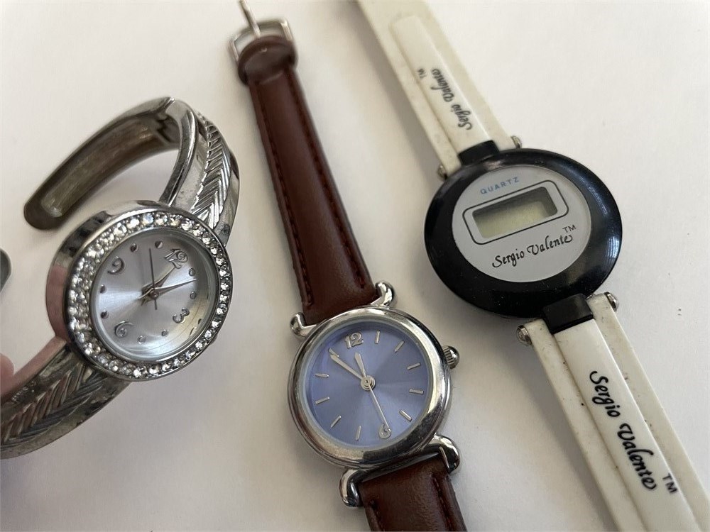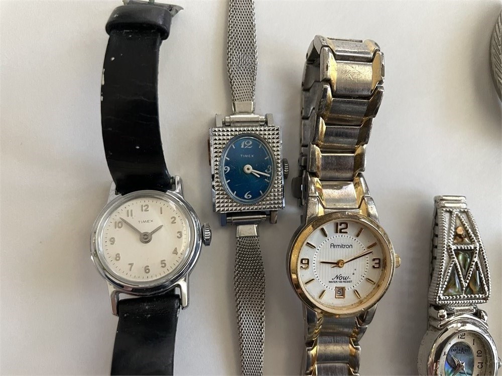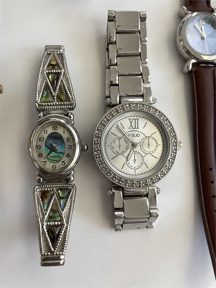 Assorted styles and conditions.  Selling the whole group together, as is.  Most look nice and probably only need a battery.  The abalone style one is missing its back; and the Armitron one is missing its crystal.  Brands include Timex, Sergio Valente, Folio.