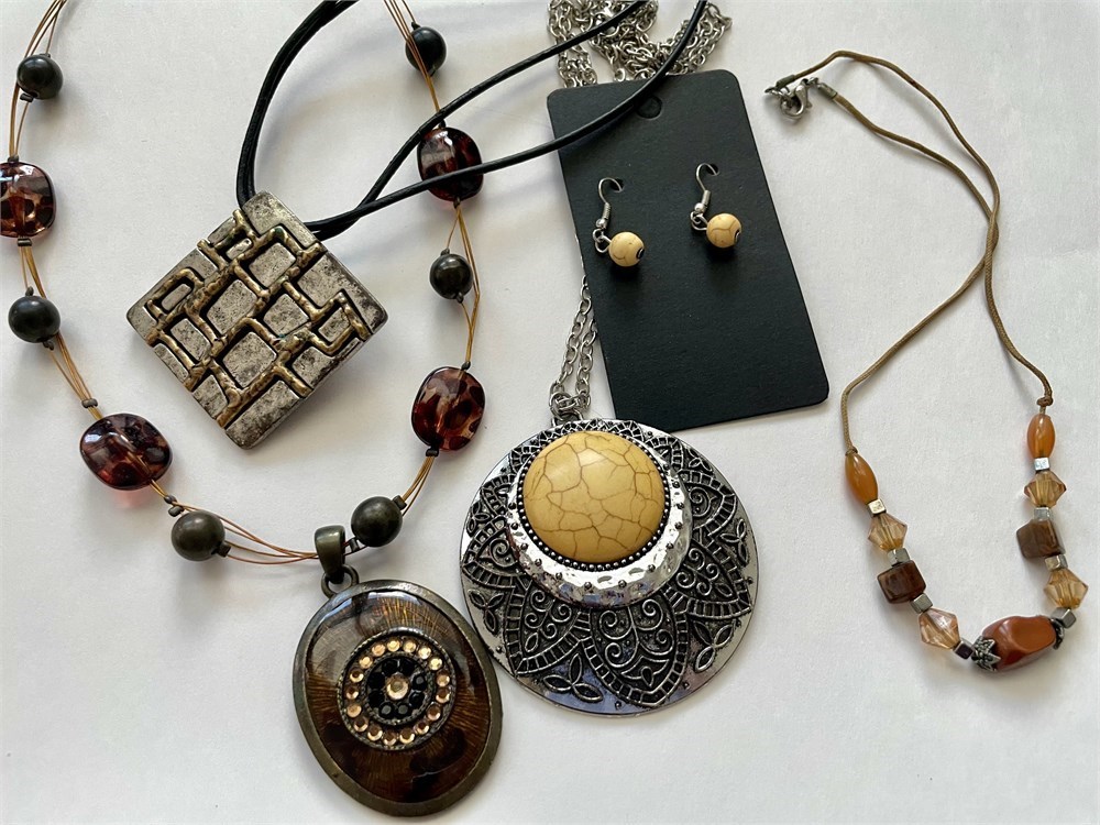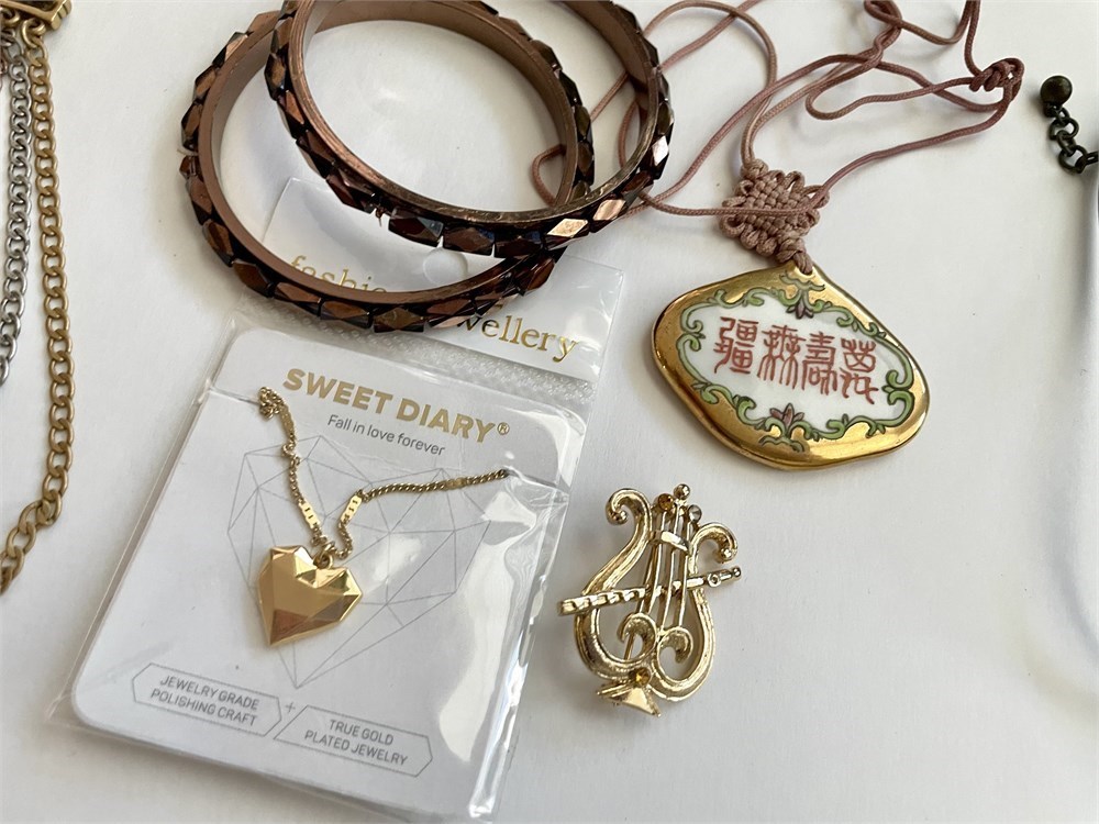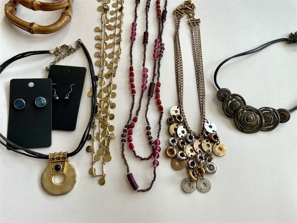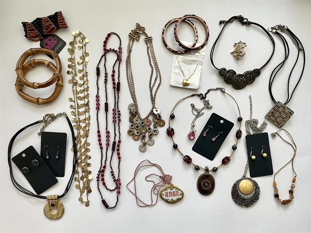 21 pieces, several nice items here.  Gold plated necklace in package, bangle bracelets, vintage Chinese painted porcelain pendant; 4 necklaces Chico's brand; more.