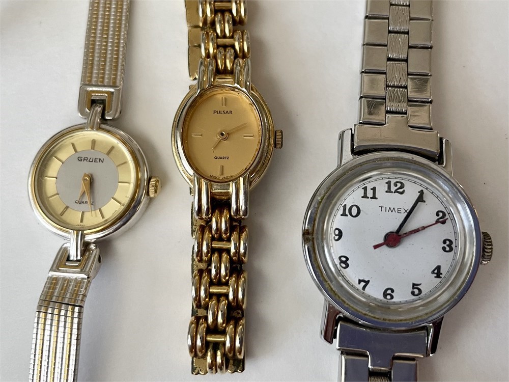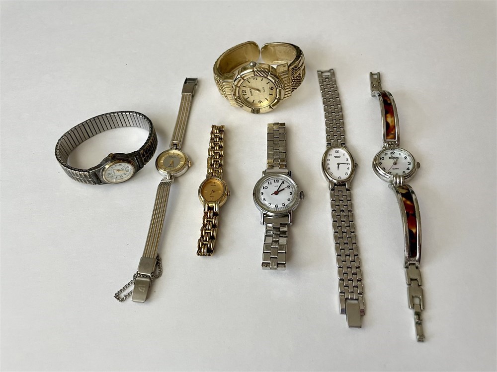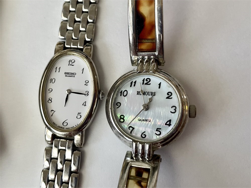 7 ladies' watches, presumably needing batteries.  Brands including Seiko, Rumours, Pulsar, Timex, Gruen, Geneva, Armitron.