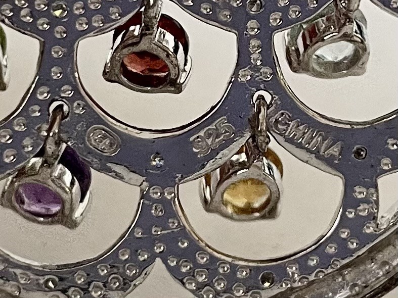 A bright sterling pendant with fish scale design featuring dangling stones in a variety of colors.  Not small; it's about 1 1/2" diameter.  Marked 925.