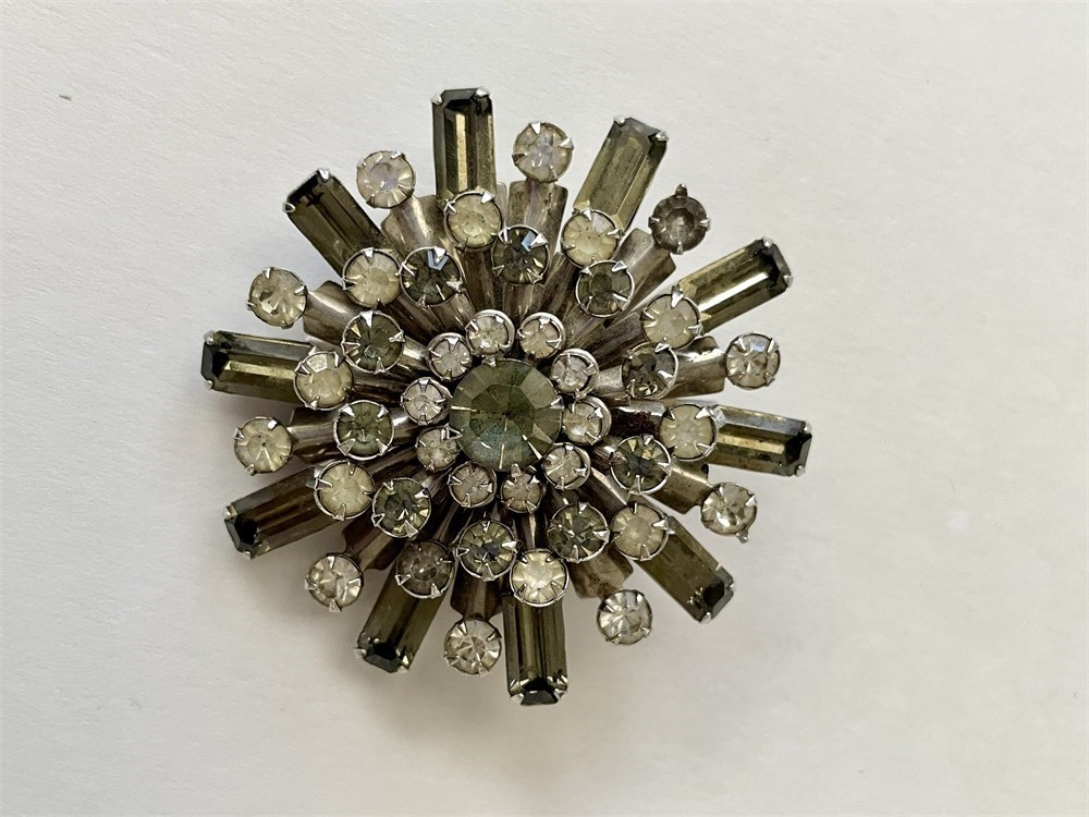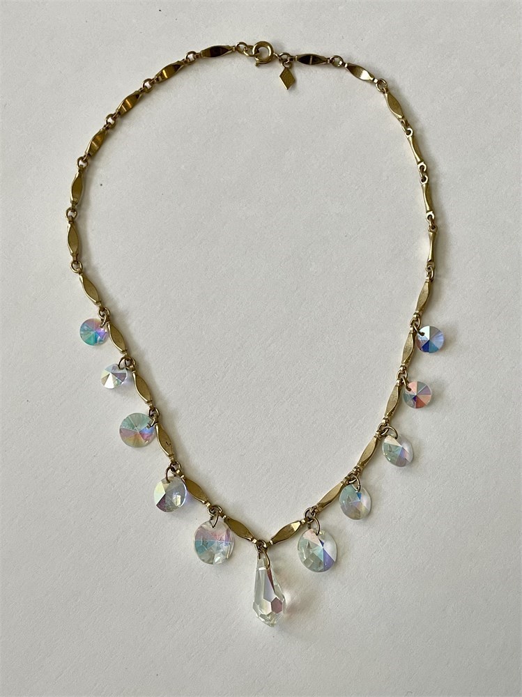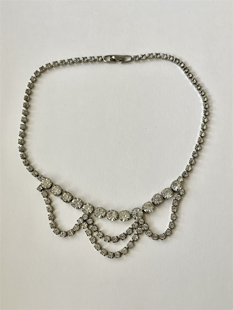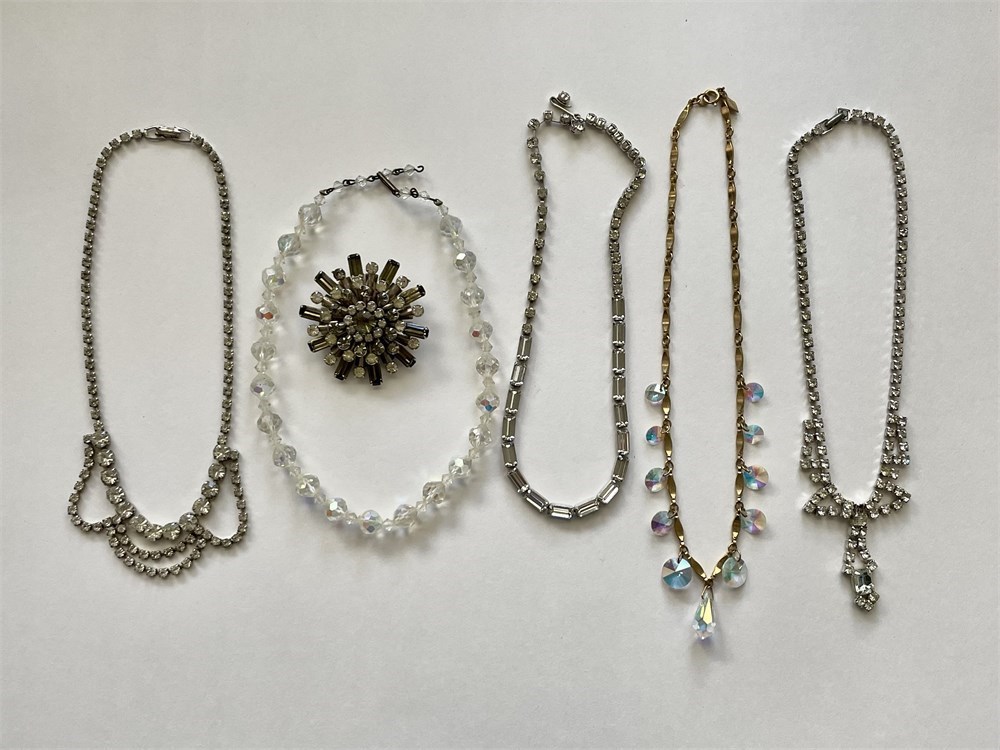 A vintage group including 3 rhinestone necklaces, a fancy pin with smoky stones, an Aurora Borealis choker, and a goldtone necklace by Sarah Coventry.  One of the rhinestones is missing on one of the necklaces.  Everything else looks good.
