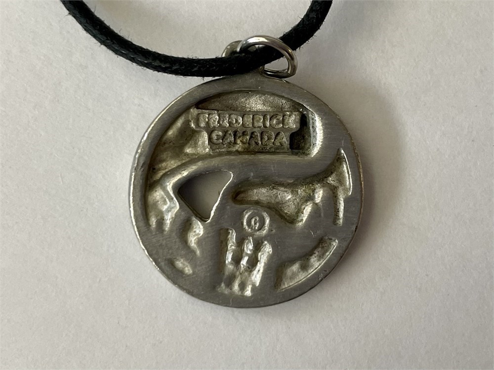 A pewter(?) pendant on cord, signed Fredrick / Canada, designed to represent the tribes of the Pacific Northwest.