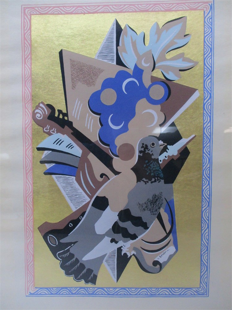 This is an original GINO SEVERINI Color Pochoir abstract composition.  We are lucky to have 11 of these 16 Original Color Pochoirs from his FLEURS et MASQUES series, by this renowned Italian painter. This is #3 and titled "LES PIGEONS et le RAISIN" (Pigeons & Grapes).  A still life with a Dove or Pigeon and clusters of Grapes, possibly accompanied by a guitar or mask motif.   Each one of these plates measure 18 x 12.75",  signed, in amazing condition and individually sleeved for protection.