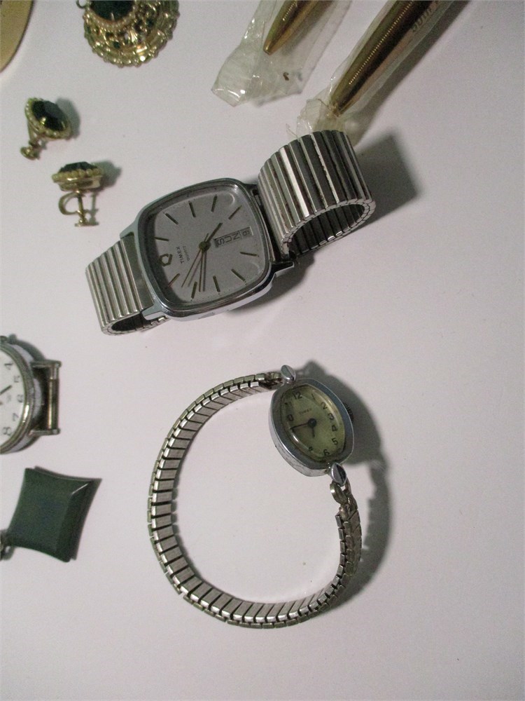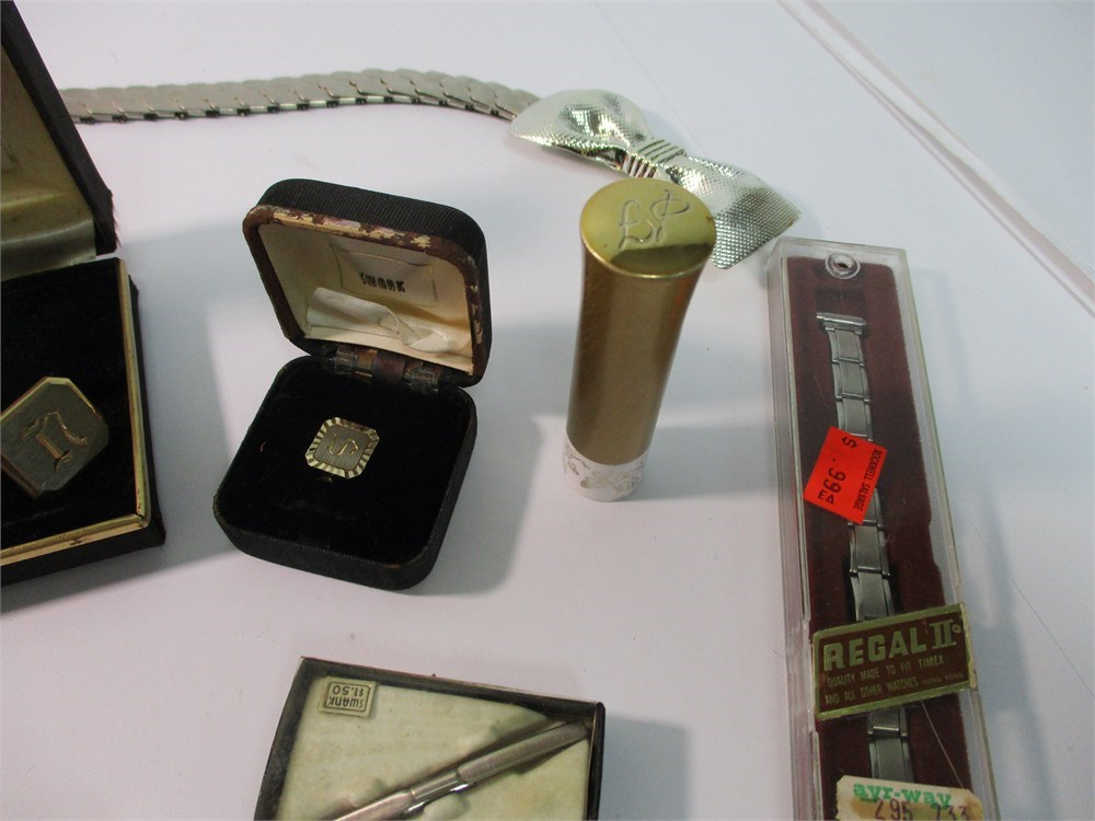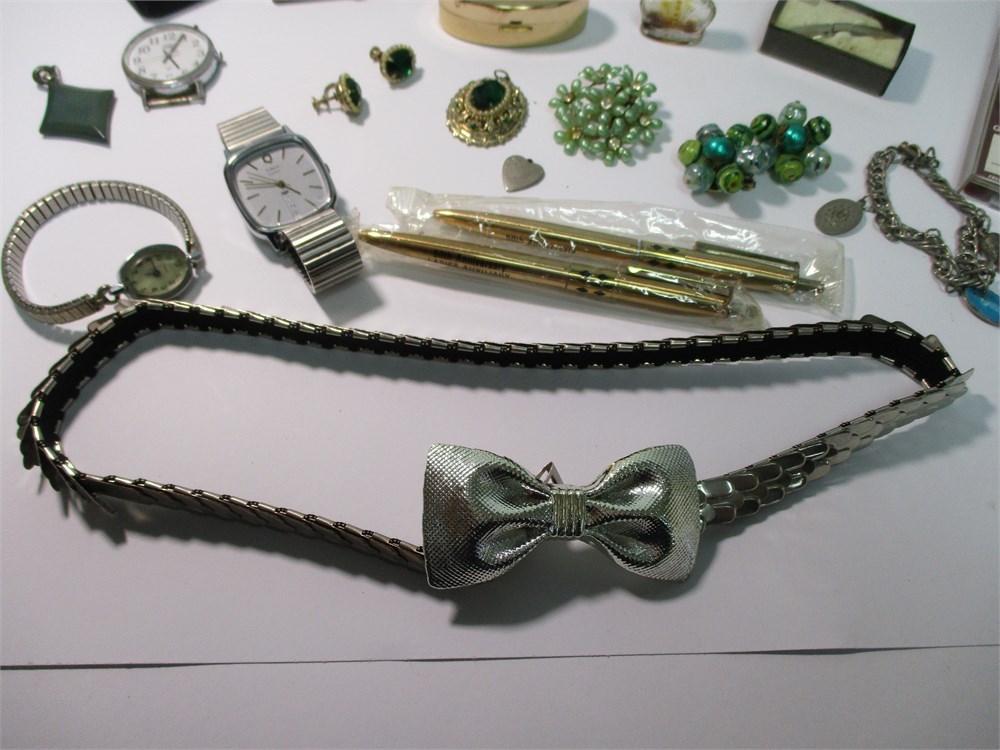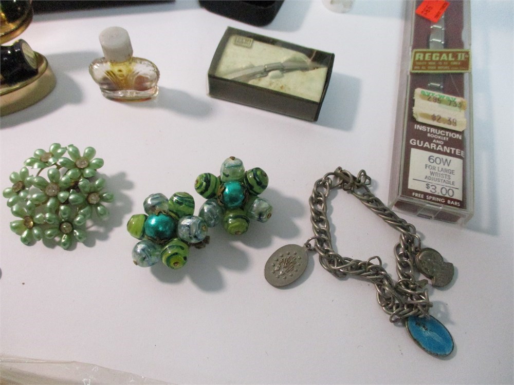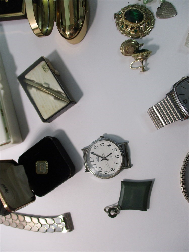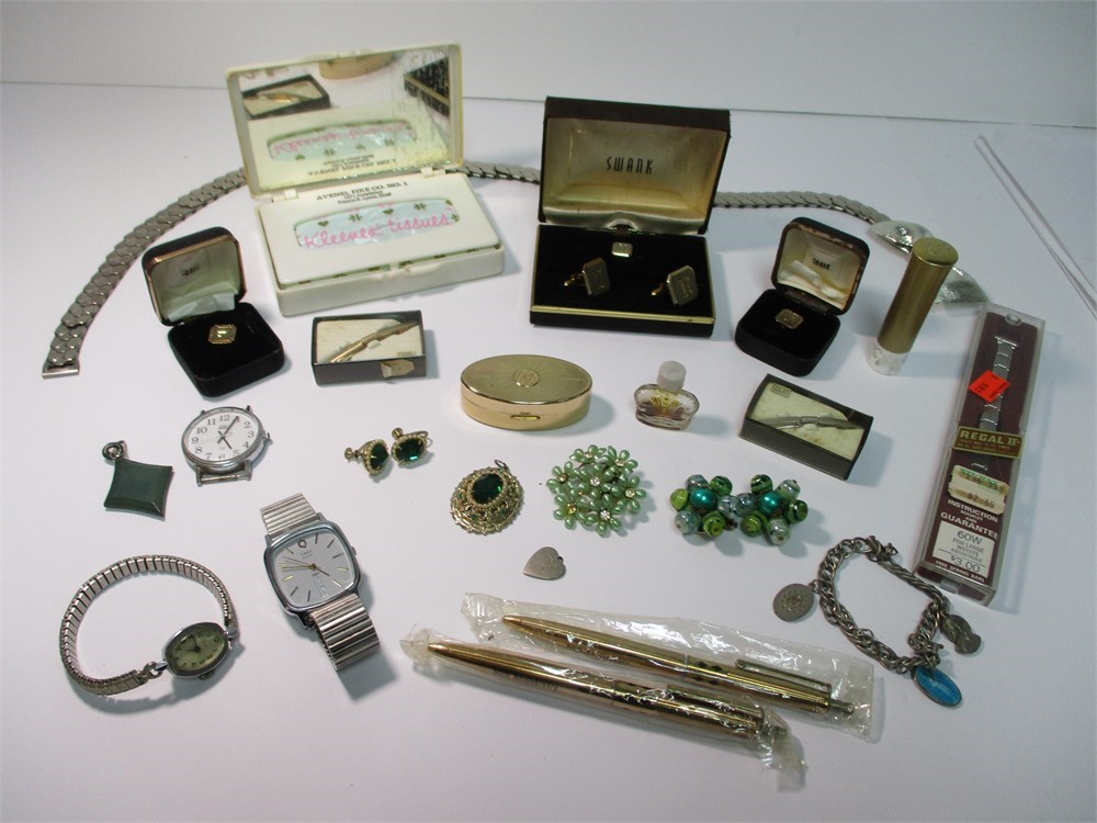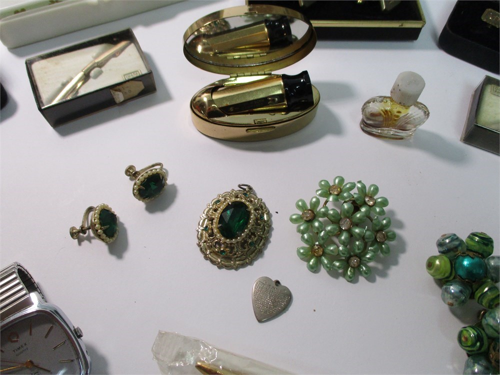 This Vintage Mixed Lot consists of Jewelry, Cosmetics Watches for both Men and Woman and more!  A little something for everyone!  Lot F